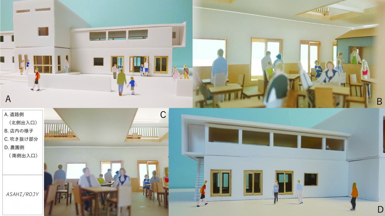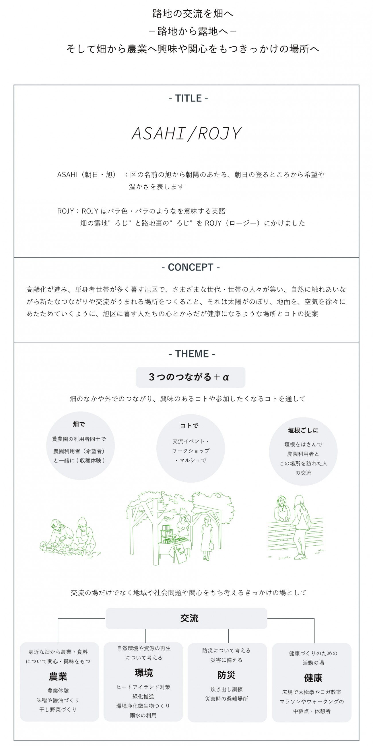 敷地には貸し農園と広場、ふれあい農園をつくり、レクリエーションだけでなく身近に畑があることにより農業問題や防災、環境についても考える場として、また畑にまつわることから様々な問題を考えたり気づいたりする機会となるコトの提案をしました。地域のひとたちの新たな交流の場として、路地の光景を露地へとつなげていきます。