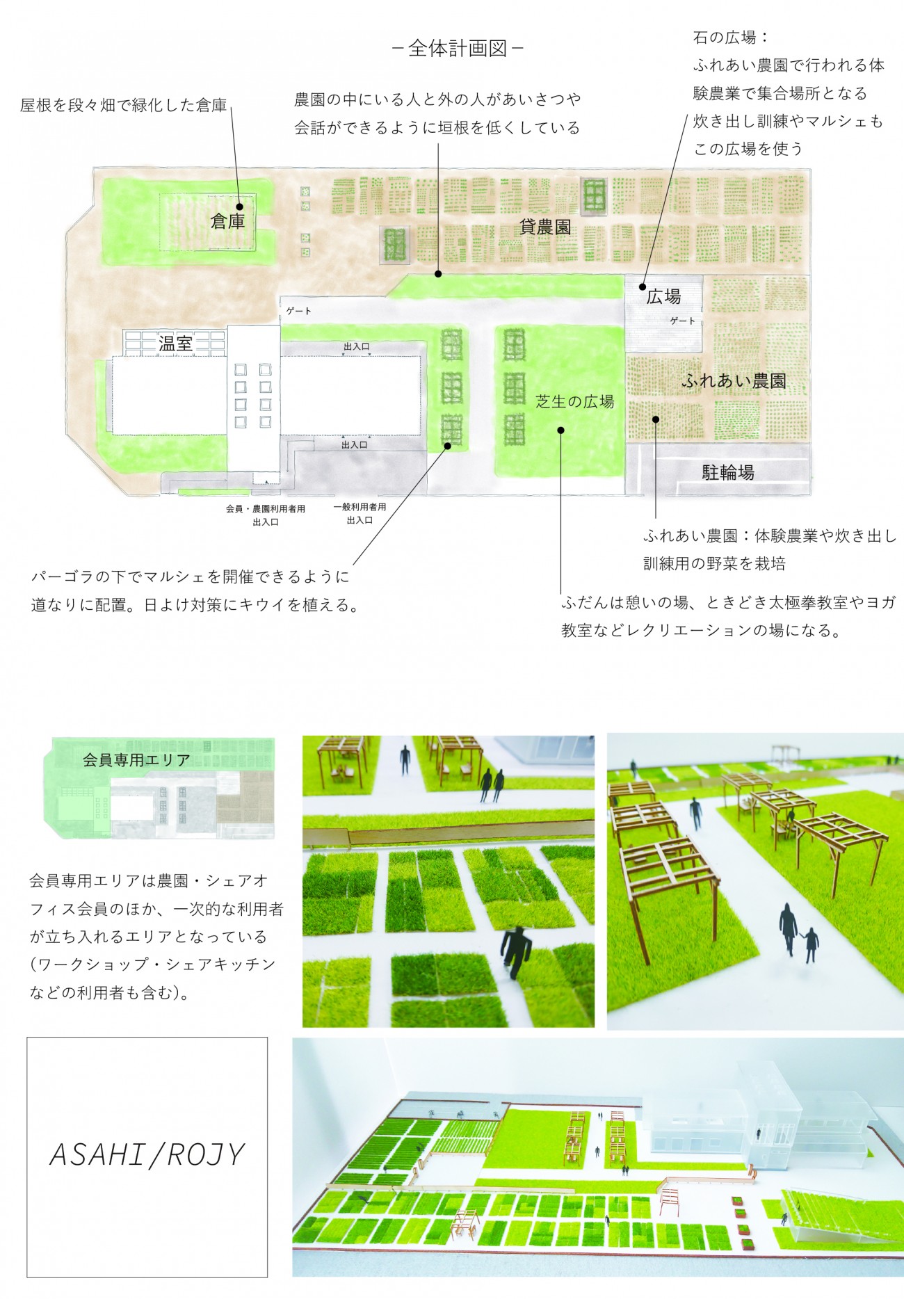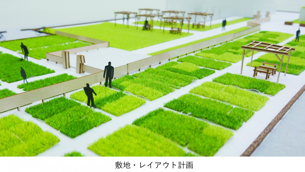 敷地は農園利用者や一次的な利用者(セミナーやワークショップ)が利用できる会員専用のエリア、誰でもが入れる2つのエリアに分けている。交通手段として徒歩と自転車としており、駐輪場を西側に配置(50台駐輪可能)した。貸農園には一区画10平米(4m×2.5m)の30区画の畑が作られている。
