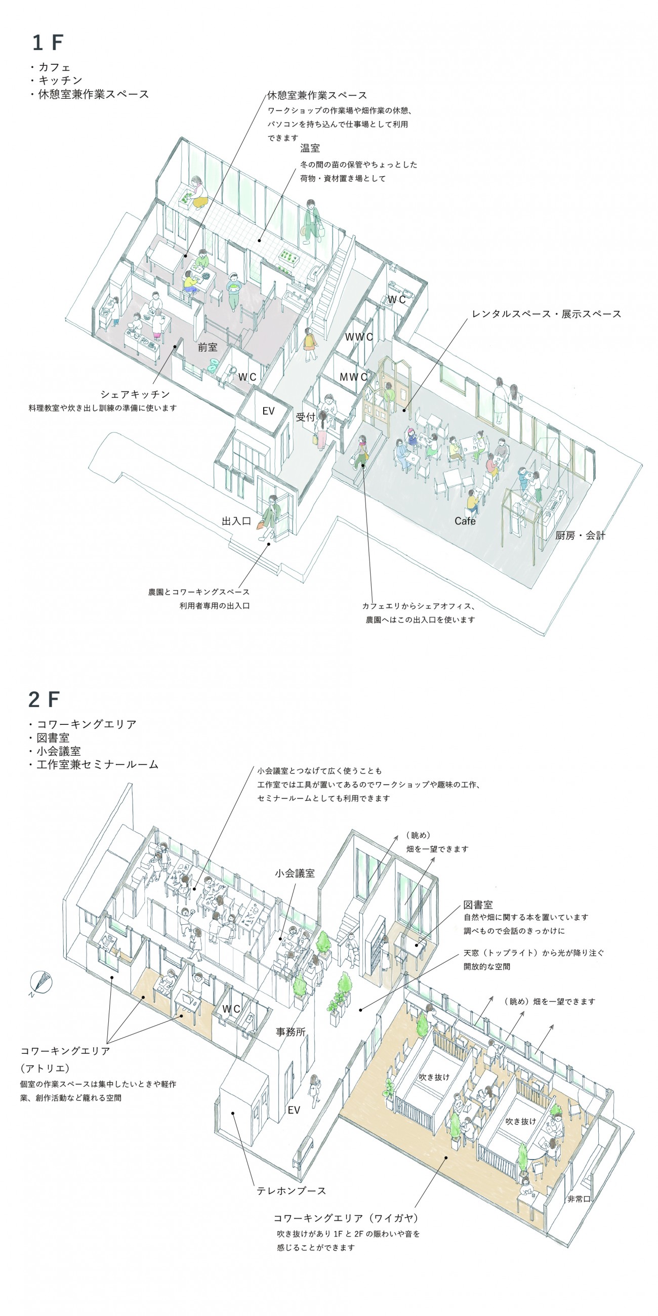 建物は1階部分をカフェと会員専用のエリアに分けた。カフェから受付を通れば、会員エリアの行き来が可能となっており、シェアオフィスの利用者も気軽にカフェが利用できるようにしている。2階部分は会員専用エリアとなっており、北側の正面玄関(会員専用)またはカフェ側の出入り口を使って入り、階段またはエレベーターであがる。2階の半分はシェアオフィス・コワーキングエリアとした。