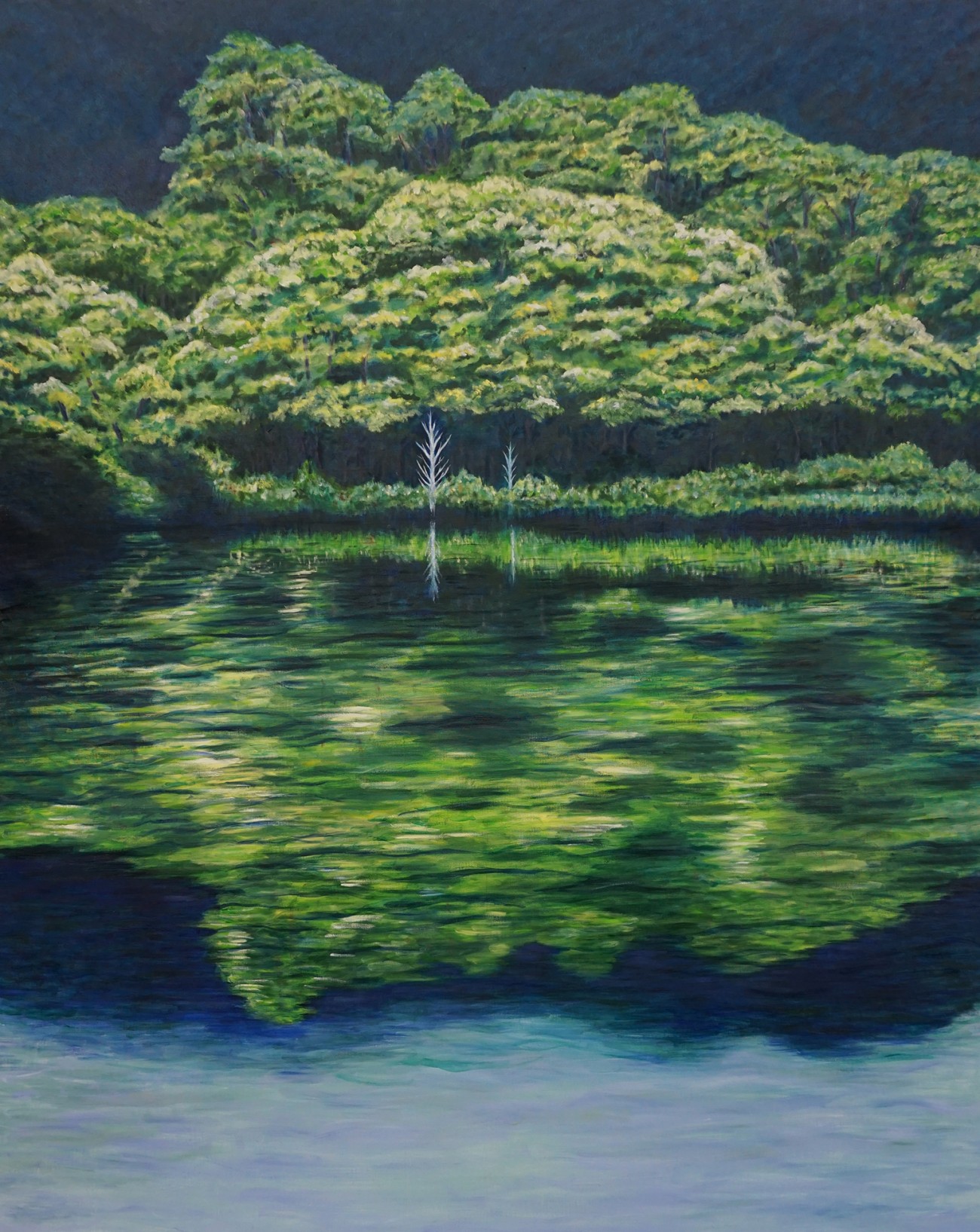 田貫湖は富士山西麓の一画に位置する小さな静寂感漂う湖。縦長の構図にし湖面を広くとり画面背景に長者ケ岳が覆いかぶさる。周囲の景色が映り込む湖面は淡く静かに波打ち、湖畔には白い木がひっそり立っている。