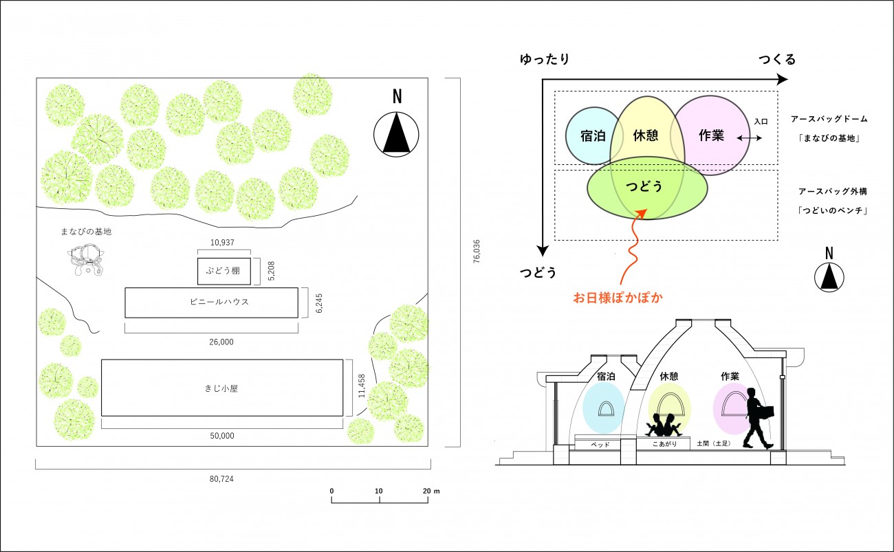 【プラン】自然のなかで子どもたちがのびのびと遊びまなぶ学校「ゼロスクール」。ゼロスクールは自然豊かな熊本にあります。学校には竹でつくったアスレチックや畑、動物たちもいて、子どもたちの生き生きとした笑顔が印象的でした。動物たちの糞を堆肥化して畑に使用したり、畑で取れた食材を使ったりと現代社会に必要な温かさと暮らしのまなびが詰まっている学校です。今回は、新たに開校した菊池校の土地にアースバッグのまなびの基地とつどいのベンチを設計しました。