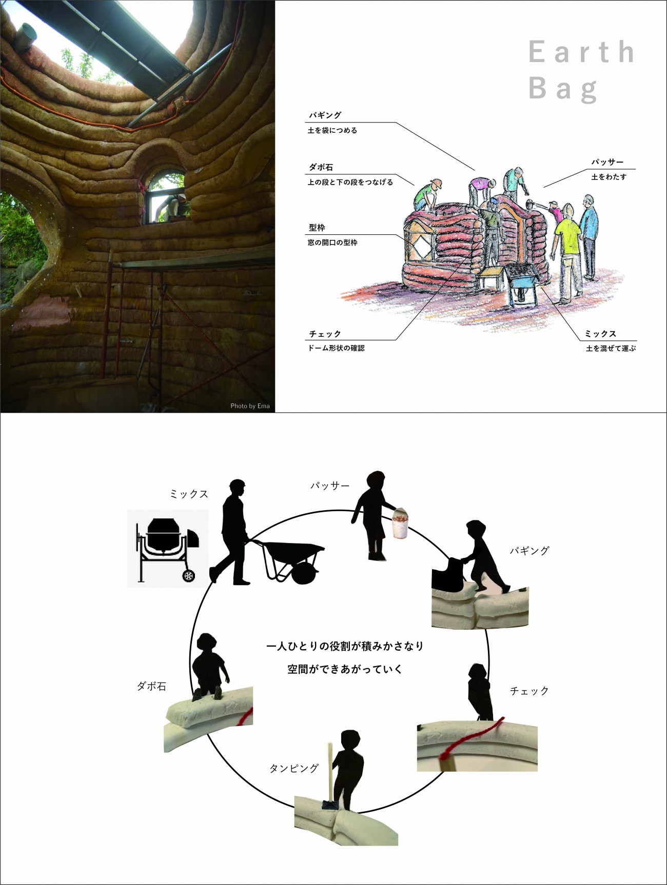 【アースバッグ工法】古代中東建築をヒントに考案された方法で土を詰めた袋を積みあげることで空間をつくる工法です。シンプルな工法のため子どもから大人まで参加でき、一人ひとりが役割を持ちながら一つのものを作り上げることでコミュニティーが生まれます。身近な素材である「土」を使って「てしごと」を重ねて空間をつくること、仲間と共につくる過程をたのしむ工法であること、 つくった空間を大切に手直しして使っていくことからアースバッグ工法を選択しました。