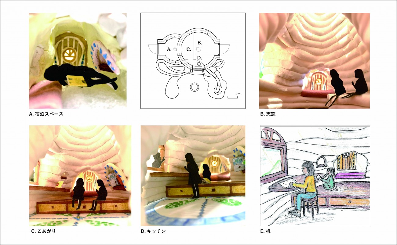 【まなびの基地】てしごとのぬくもりに包まれた温かい空間。 A.様々な人が訪れることができるように宿泊スペース、B.天窓から降り注ぐ光、C.こあがりでつどう少女。こあがりは小さな図書館になっている。 D.キッチンから外へとつながる窓。E.キッチンは流しに蓋をして机としても使用することができる。