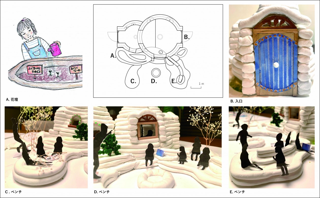 【つどいのベンチ】景色の良い南側にもうけた心地よいつどいの空間。 A.花壇。森で見つけた種やお気に入りの植物を育てる。B.入口ドア。施工しやすい長方形のドアを装飾することで丸くみせる。C.幅を広くとったベンチ。舞台としても使用することができる。 D.ファイヤーピッドを囲うよう2つのベンチを配置。E.柔らかな曲線と中央の段差により、座り方のバリエーションが豊富なベンチ。