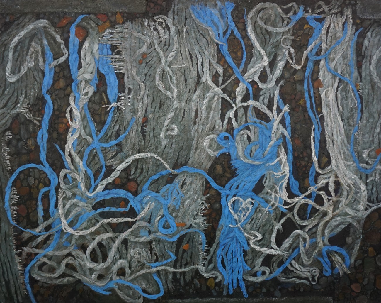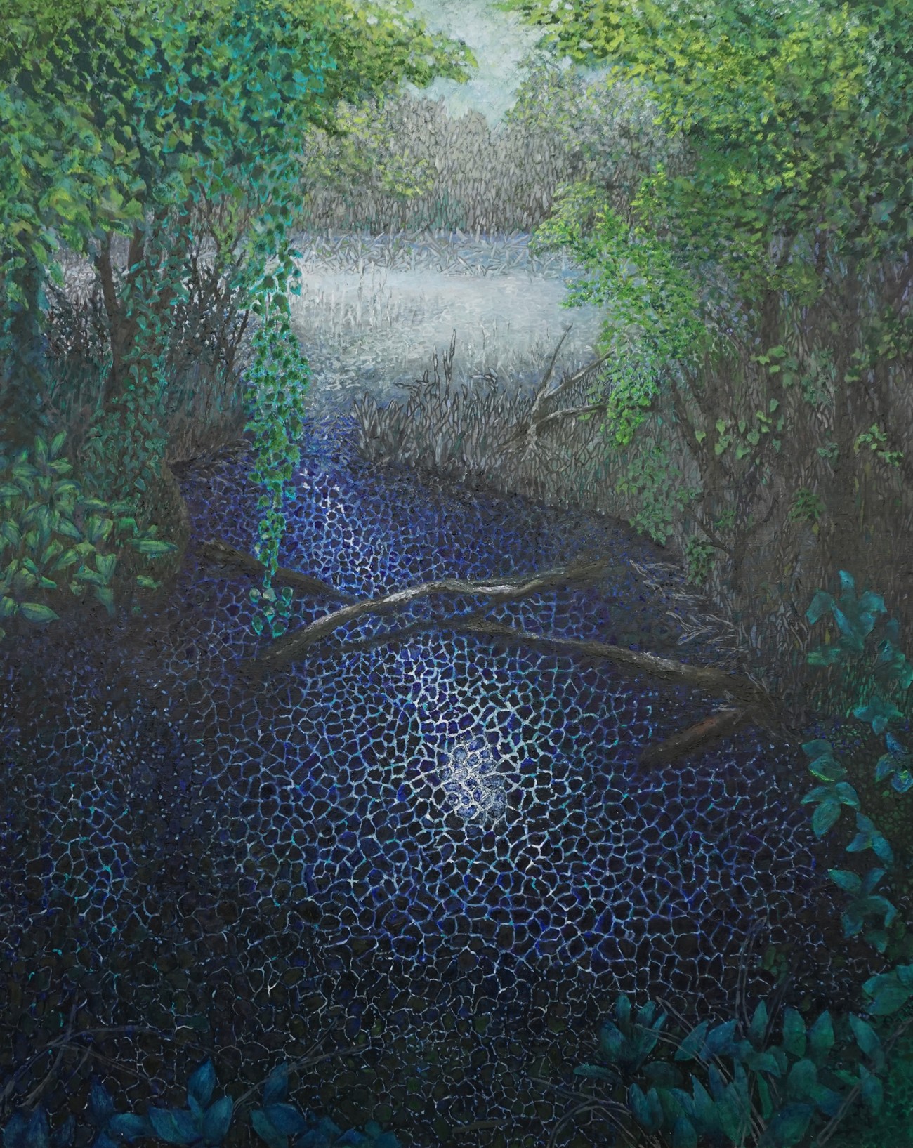 犬を連れて出かけた河川敷で出会った景色だ。犬を追う為に下を向いて歩いていて、ふと顔を上げた。向こうから強い光がきた。河川敷にはいくつかの沼が出来ていて、周りに無秩序に木々が、生えたり倒れたり重なったりしていた。光はその沼に反射したものだった。
