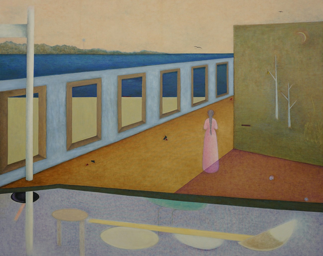 狭間という字は狭い間と書くけれど、事と事との間という意味もある。「漸くの思いでドアの側まできた女性であったが、左手には壁のようなものがあり、前方奥まで続いていることに気づいた…彼女は今、狭間に在る」そんなストーリーを思い浮かべ、女性の揺れる心を絵に表現したいと思った。