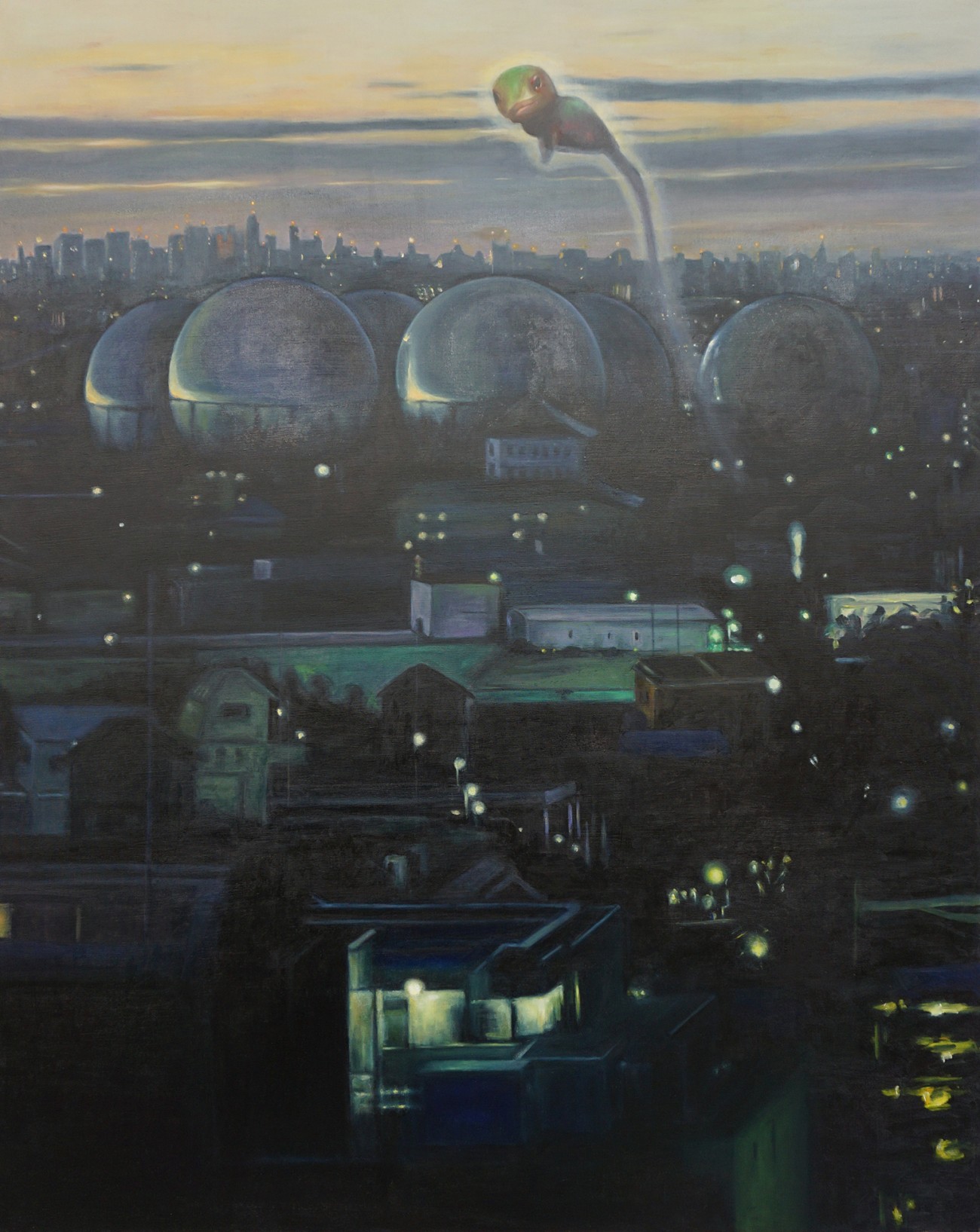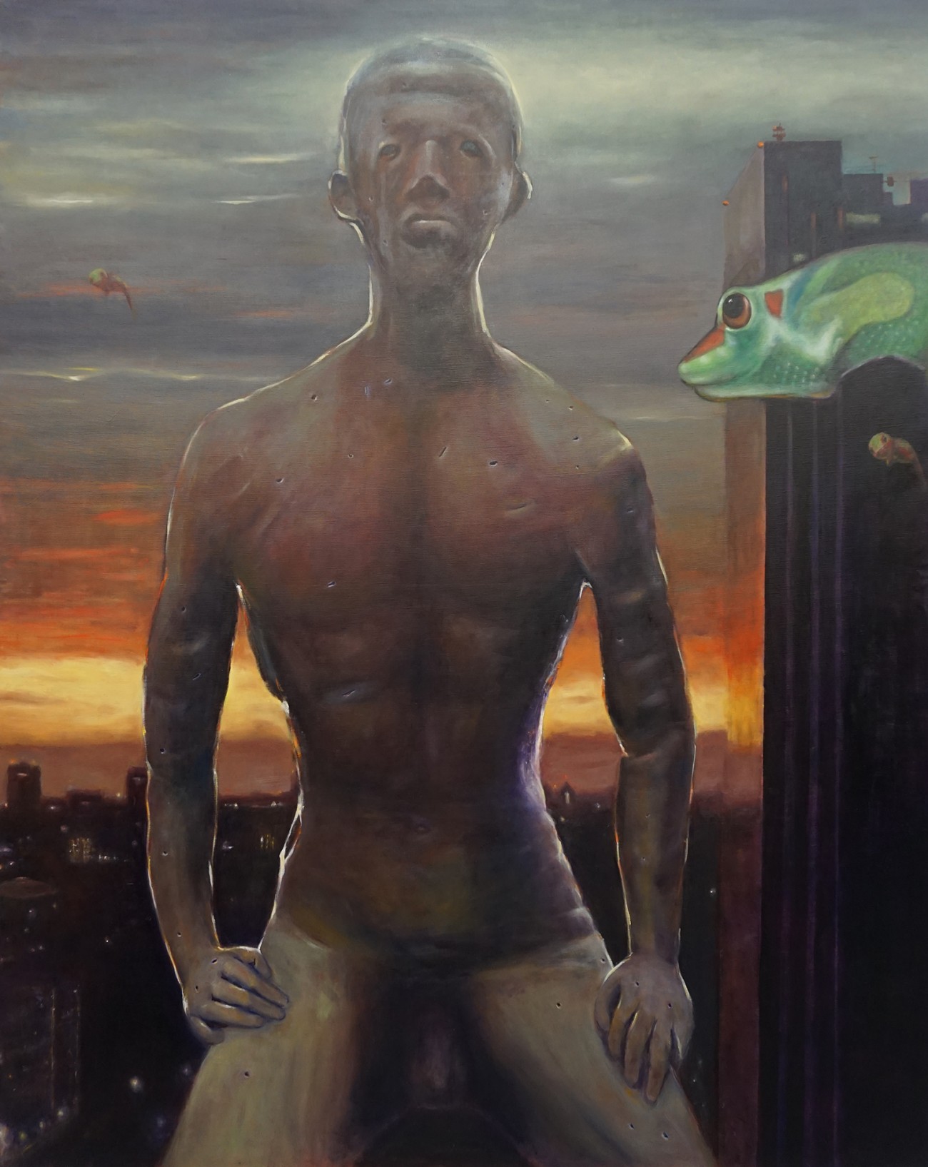 スクーリングで作成した塑像のイメージを都会の夕陽の中に置いてみたくなった。柔らかな夕陽に包まれて塑像に命が宿っていく。一見屈強そうな若者だが実はボロボロ、疲れ切ってしまっている。それでも凛として自分を保とうとしている。何者かがそれをジッと見ている。