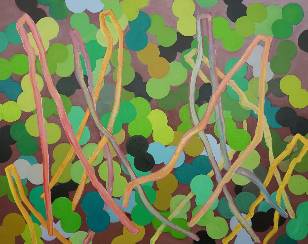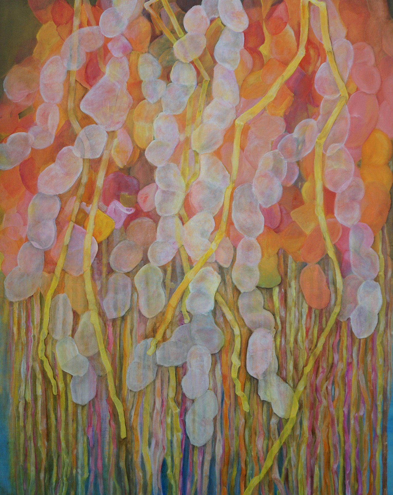 私は数年前より、手漉きの紙で作品を作っている。今回は自身で漉き上げた和紙を、枝垂れ桜や柳などのように糸で垂れ下げ、オブジェを作り、それ見ながら作品を描いた。和紙は湿度や気温の変化で姿を変えていく。まるで、植物が枯れていくように日々、形を変える。この、垂れ下がる和紙の変化から感じた印象を絵に表現した。