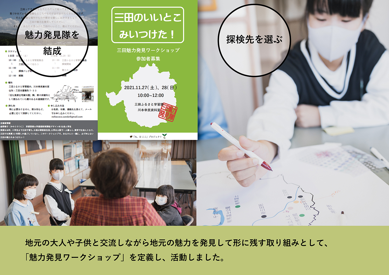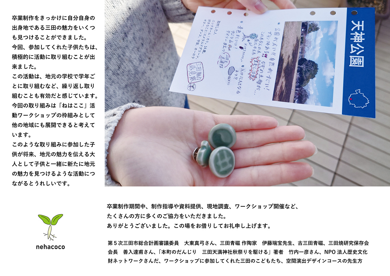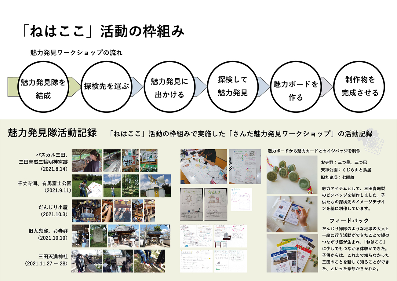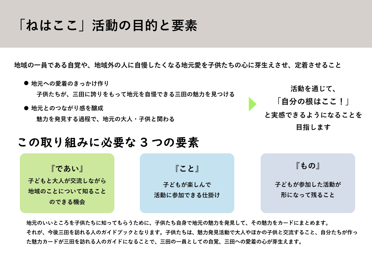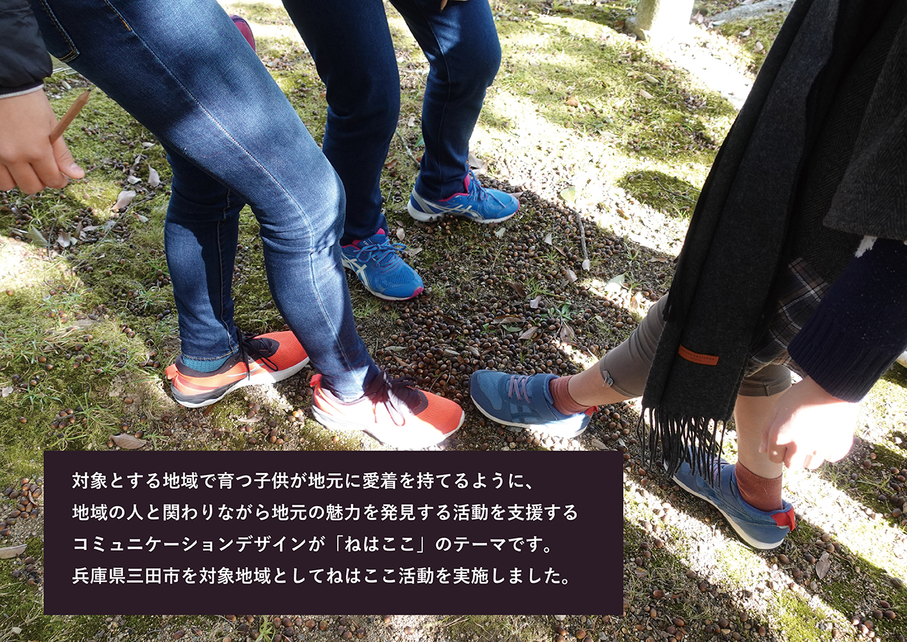 対象とする地域で育つ子供が地元に愛着を持てるように、地域の人と関わりながら地元の魅力を発見する活動を支援するコミュニケーションデザインが「ねはここ」のテーマです。