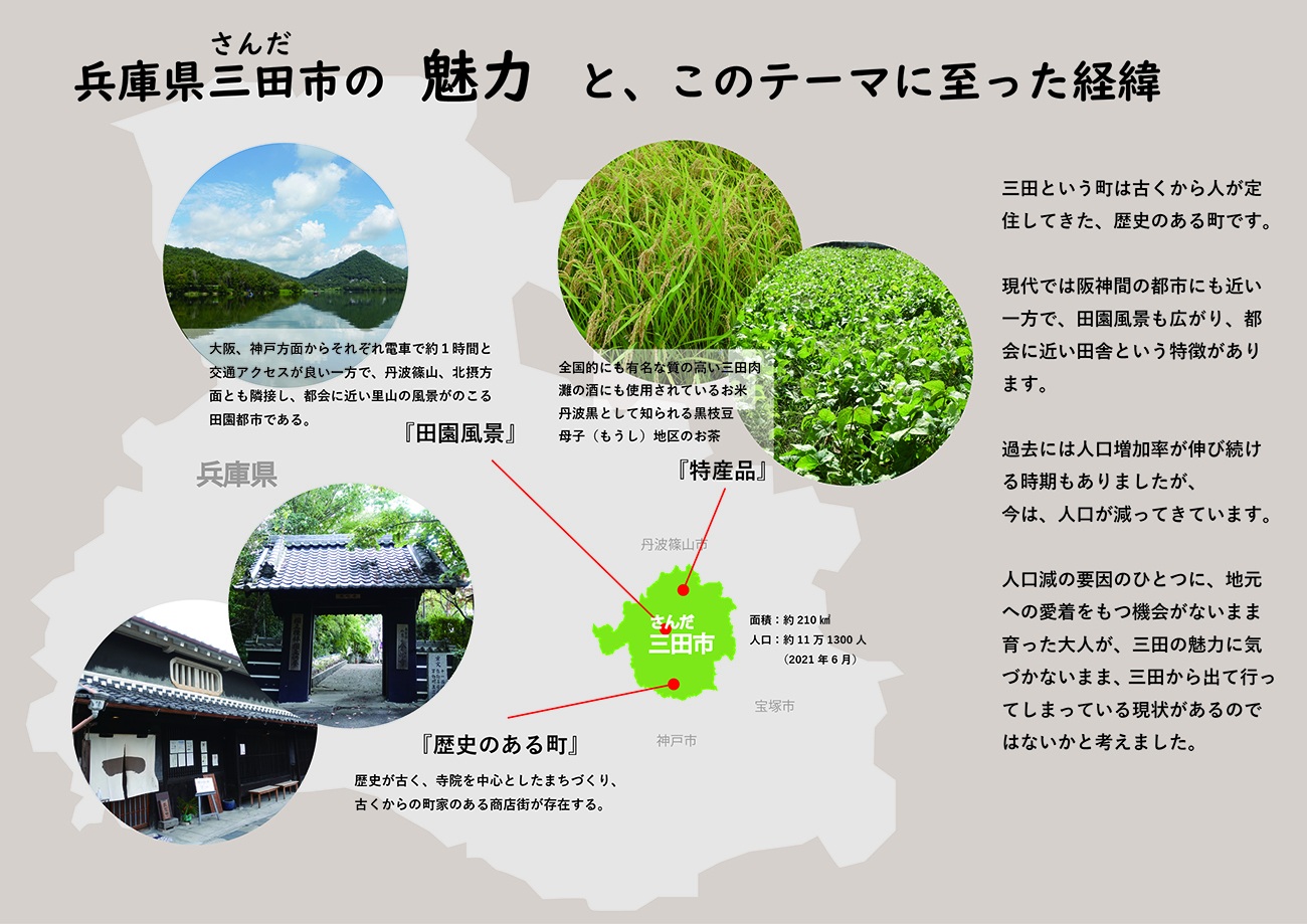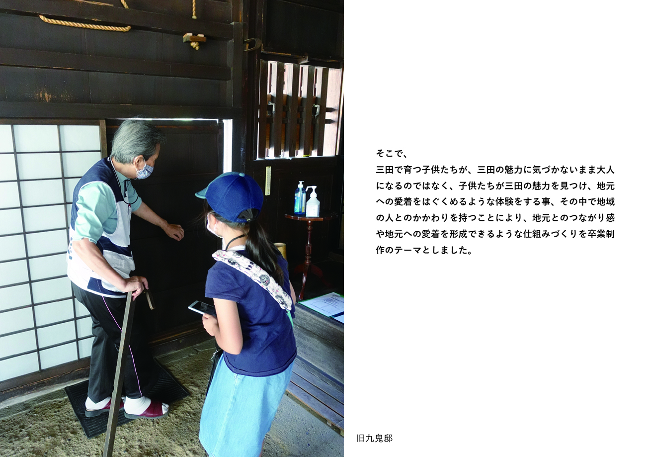 三田で育つ子供たちが、三田の魅力に気づかないまま大人になるのではなく、子供たちが三田の魅力を見つけ、地元への愛着をはぐくめるような体験をする事、その中で地域の人とのかかわりを持つことにより、地元とのつながり感や地元への愛着を形成できるような仕組みづくりが卒業制作のテーマです。