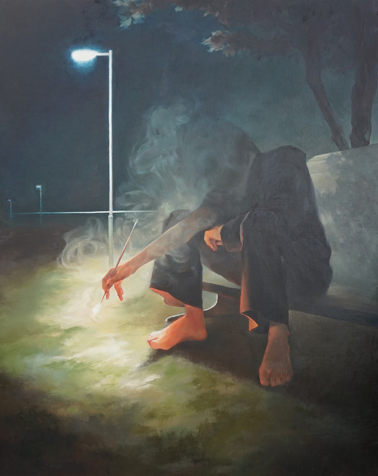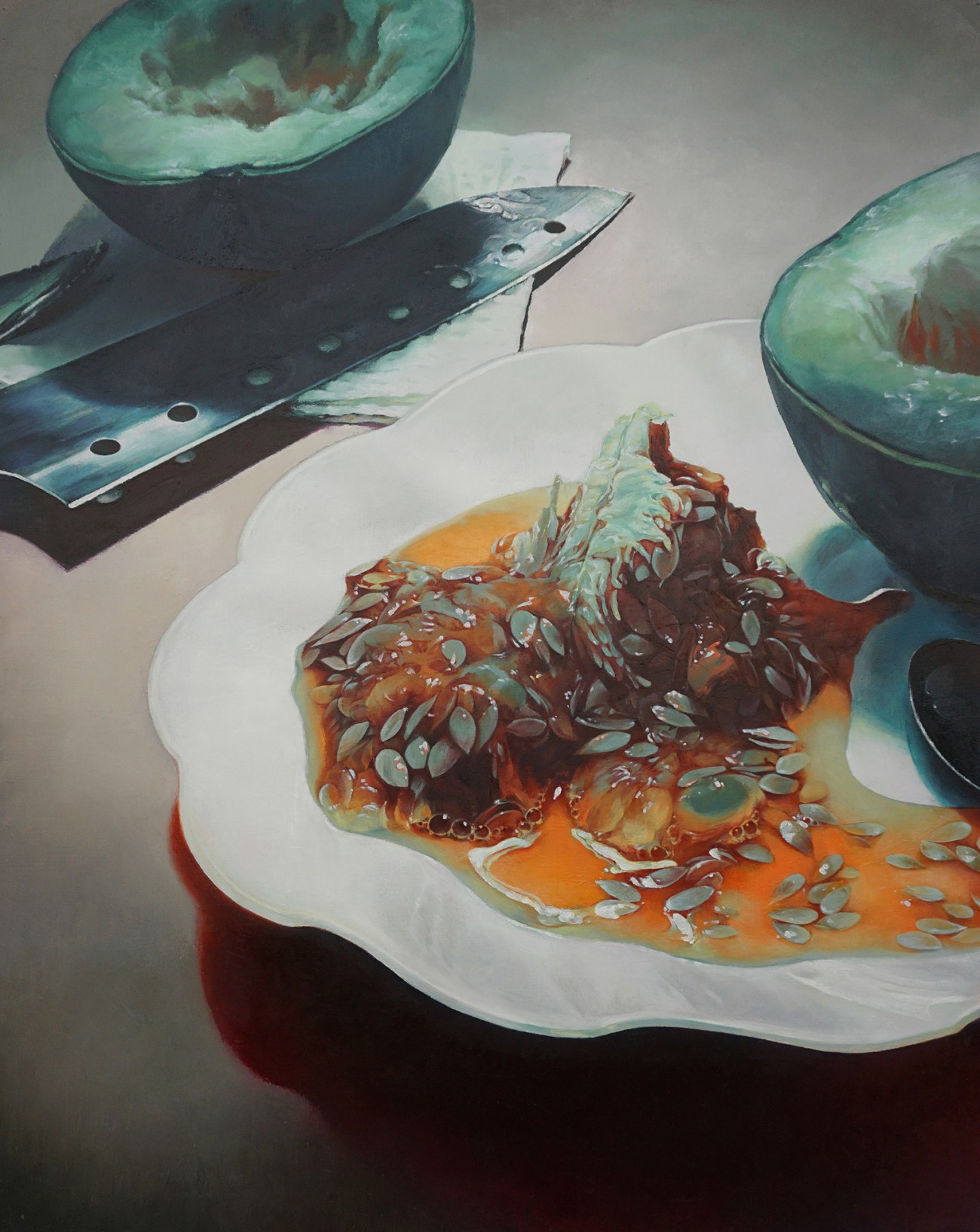 メロンの果肉に見た瑞々しい生きもの感と、肉体の中身としての種子とワタを描きたかった。その蕩けたうねりを美しく思うと同時に、何であれ生きものの肉を割って食することも自戒していたいと思う。生命らしくうねる形への罪悪感と、その綺麗さへの憧れのようなものとが燃料になった制作だった。