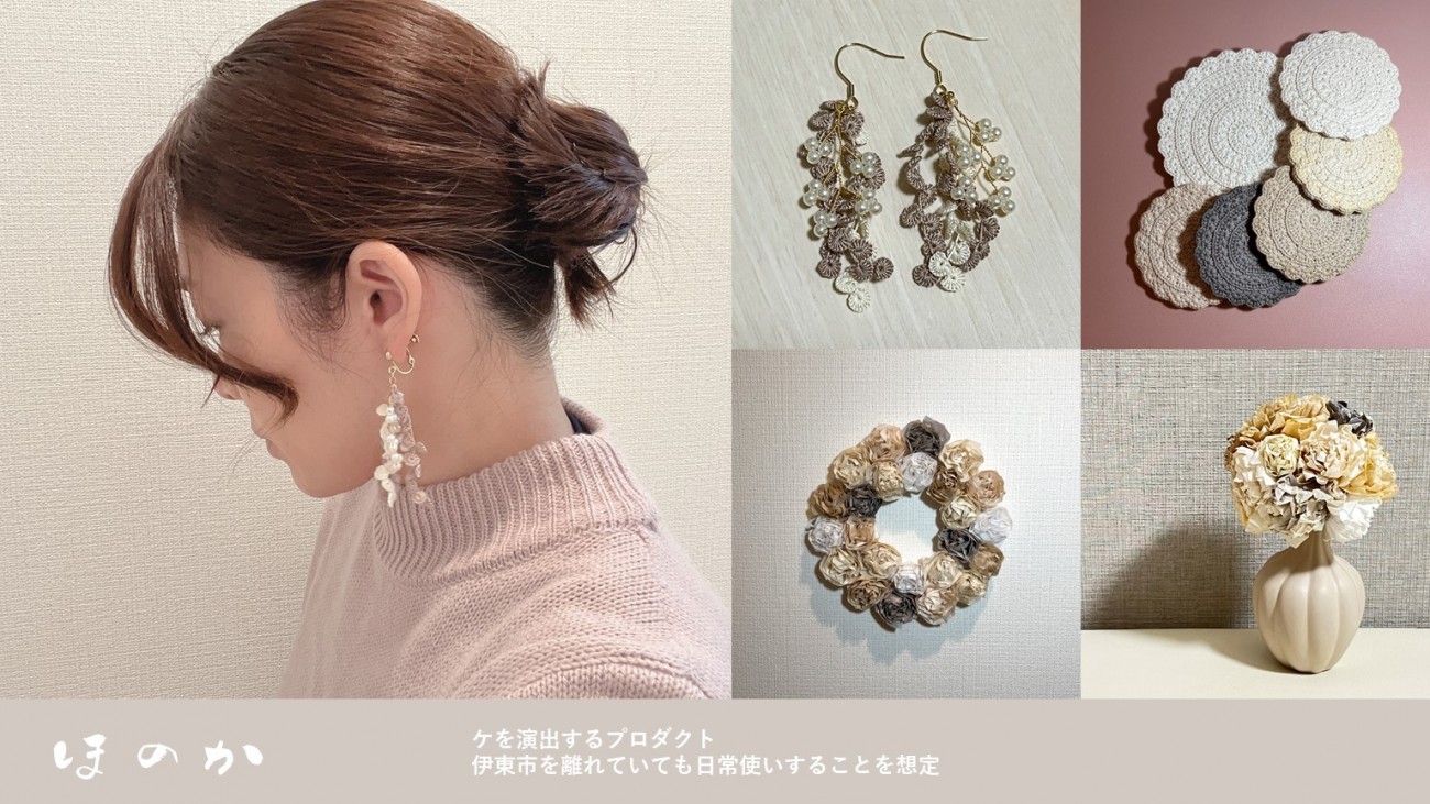 ほのかでは、伊東を離れていても日常使いできるものとして、ピアス、コースターとポットマット、フラワーリースとフラワーブーケを作成