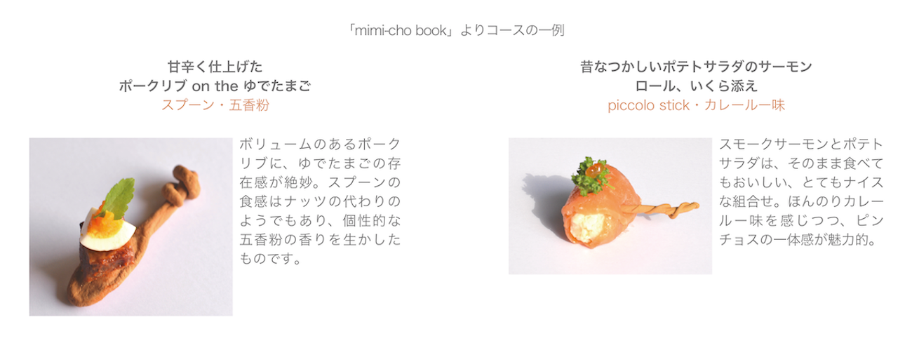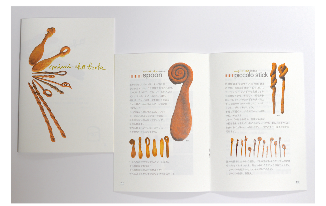 ミミーチョへの想いをカタチにした冊子を作成。箸だけでなく、スプーンやピッコロスティックなどミミーチョの仲間も紹介。 また料理とのマリアージュをひとつの流れで感じてもらえるようにコース仕立てにするなど、おいしく、お洒落にたのしめるように工夫を凝らしました。