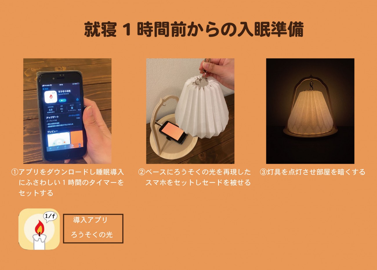 ネムリズムは、就寝 1 時間前からの入眠準備とし、スマホがないと成り立たないかつ、1/F ゆらぎでリラックスできる空間が作れるプロダクトをコンセプトに製作しました。スマホアプリを使用することで、スマホをプロダクトへ置くことに必然性を持たせました。また、スマホは必ず充電が必要です。就寝前の充電のために置くようにすることで習慣化を目指します。 スマホから離れるだけでは、身体は就寝前の良い状態になりません。そこで、スマホから離れた後は就寝までの時間を 1/f ゆらぎを視覚から感じる空間で自分のすきなことをして過ごし、睡眠に良い状態へ持っていきます。