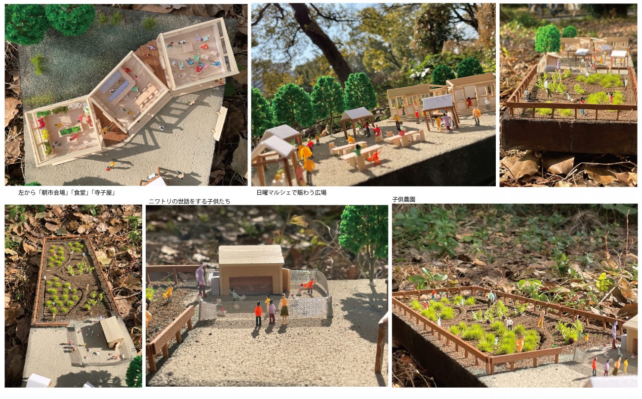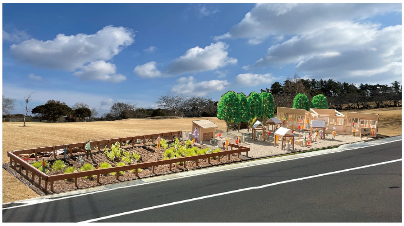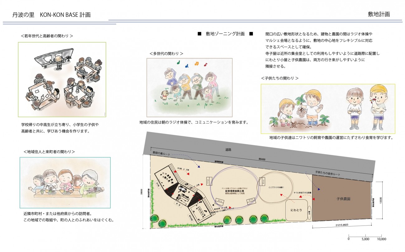 週末にマルシェができる広場を中心として、向かって右側は人が集まる建物を配置し、左側は子供たちが活動する農園やニワトリ小屋を配置。 中央広場では、地域のラジオ体操も開催。