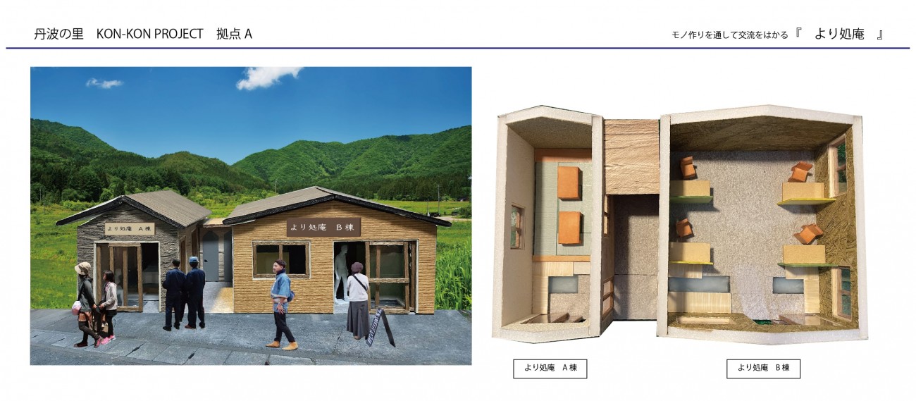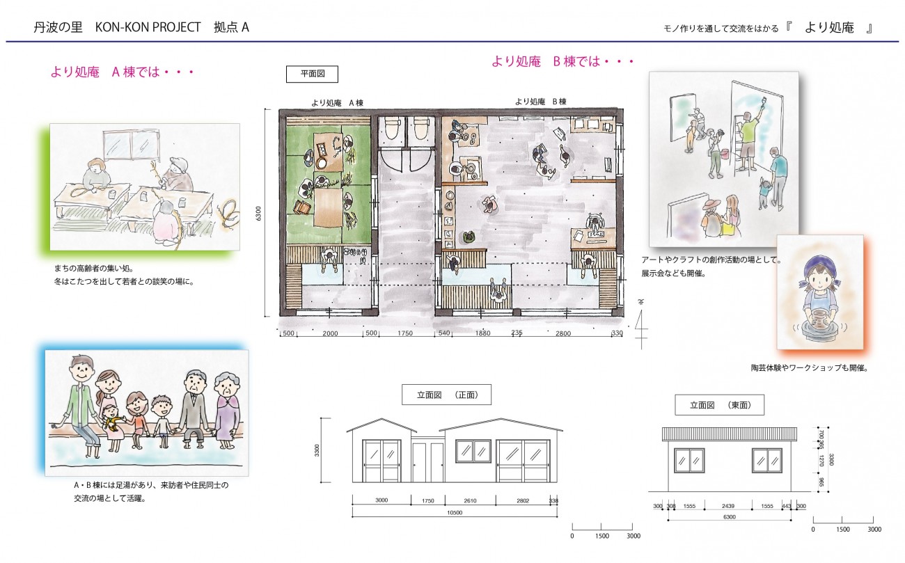 『より処庵』では2棟ある既存の建物をリノベーション。この2棟をA棟、B棟とします。 A棟ではまちの行事の支度をするおじいさんやおばあさんが集う場所。 B棟は、地域のクリエイターが集えるシェアアトリエとして、地域文化祭の拠点としての役割を担います。 この隣接した建物がそれぞれが地域や世代との交流の場となるよう建物の中には足湯スペースが設け、双方に交流ができる場とします。