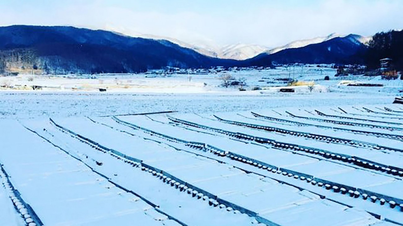 霧ヶ峰の裾野に広がる雪景色。 寒天干し場が一面真っ白に変わる。 冬場の氷点下になる厳しい冷え込みと晴天との寒暖差で、凍結と乾燥を繰り返し寒天はできあがる。 また一軒、自然の寒天づくりの生産者がその幕を閉じました。 今、地球温暖化や工業寒天の台頭で昔ながらの自然の寒天づくりが減少し絶滅するとも言われています。 この自然の寒天づくりを後世につなぎたい。 そんな思いで寒天をデザインでつなげます。