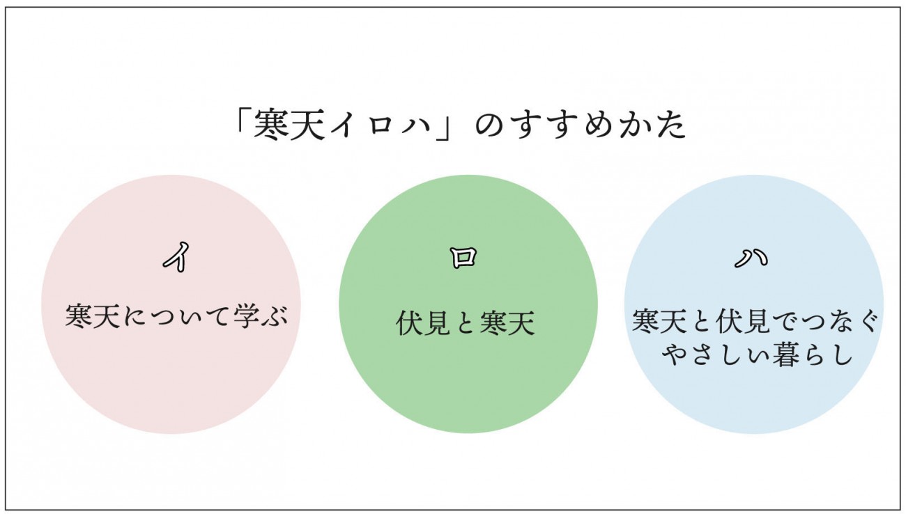 「イ・ロ・ハ」とはイロハ順のはじめの言葉となることから物事の初歩や基本を意味しています。寒天の自然循環のしくみを知って、地球にやさしい暮らしにつながるよう、「イ・ロ」のリサーチから「ハ」の提案へと順を追って進められるれように制作いたしました。 目次 イ_寒天について学ぶ ・寒天のカタチいろいろ ・寒天は何からできているの? ・テングサ採り ・自然環境でつくる寒天の生産地 ・寒天とトコロテンの違い ・寒天の多様な特性 ・こんなところにも寒天が ・寒天と近代医学 ・寒天とSDG's ロ_伏見と寒天 ・寒天発祥の地、伏見 ・寒天と命名される ・寒天広まる ・伏見寒天プロジェクト ・寒天と小説 ・伏見のまちの魅力 ・伏見とSDG's ・サスティナブルな伏見の今 ハ_寒天と伏見でつなぐやさしい暮らし ・京都の食材でつなぐ寒天のおもてなし ・寒天と伏見でつなぐコト・空間のデザイン