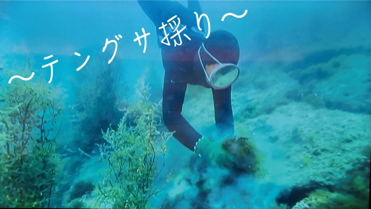 イ・・・寒天について学ぶ 寒天はテングサなどの海藻からできています。 テングサは海中の岩礁近くに生育しています。自然に生息しているテングサを直接採取するほうが上質なため、今でも素潜りなどの原始的な方法で採取されています。 酸素ボンベを背負い潜水したり、海女さんたちのように人の手で採られています。