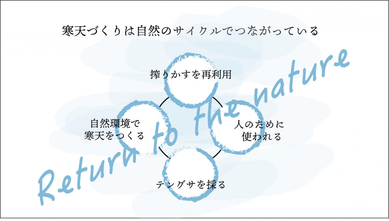 イ・・・寒天について学ぶ 寒天づくりは自然のサイクルでつながっている。 海洋に生育するテングサを採取して自然環境下での寒天づくり。 テングサを搾った粕は、家畜の飼料や野菜の肥料へと生まれ変わる。 出来上がった寒天は私たちの食卓や医学のために。 そして自然に還る。 自然に生まれ自然に還る、寒天づくりは環境にやさしい。