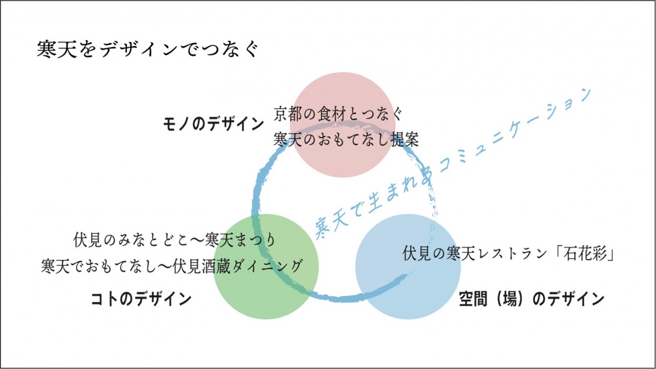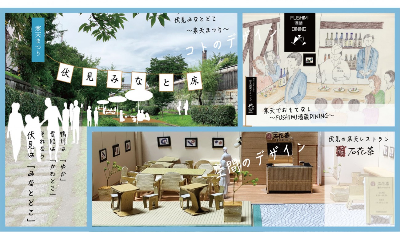ハ・・・寒天と伏見でつなぐやさしい暮らし コトのデザイン 「伏見みなとどこ(床)〜寒天まつり」 鴨川は「ゆか」、貴船は「かわどこ」、それなら伏見は「みなとどこ」 初夏の穏やかな季節に、川沿いの遊歩道につくられたで「みなとどこ」。地域のお店自慢の寒天レシピが並ぶ「寒天まつり」で賑わいます。 「FUSHIMI酒蔵DINING」 お酒を楽しむ場に欠かせないのが「酒のあて」。蔵元おすすめのお酒に合う「寒天を使った酒のあて」で、お酒の場のシーンを演出する酒蔵体験を企画しました。 空間のデザイン 「伏見の寒天レストラン〜石花菜(せっかさい)」 寒天発祥の地、伏見に寒天レストランを考えてみました。海藻からできた寒天が人にとって安心な自然素材であることを知ると、健康のこと、地球環境のこととナチュラルな暮らしへと気持ちが向かっていったのではないでしょうか。誰人ひとりとして取り残さない「SDG’s」という持続可能な暮らしかた、この地球上のすべての生命のためにやさしい暮らしへとつなぐ発信の場として企画しました。