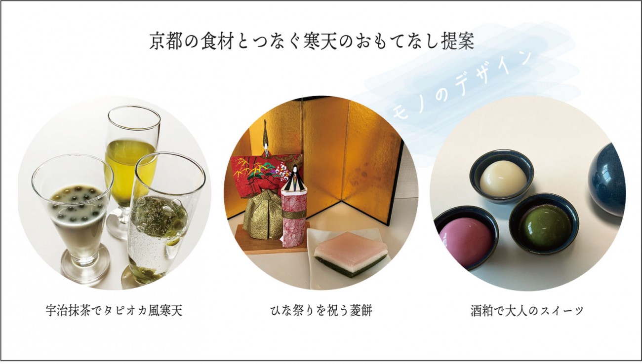 ハ・・・寒天と伏見でつなぐやさしい暮らし モノのデザイン 京都の食材で地域や暮らしの中で楽しめる寒天のおもてなしのレシピを考えてみました。四季折々の食材を使った寒天レシピや歳時を寒天でお祝いしたり、寒天ライフをきっかけに会話が弾み、地球にも身体にもやさしい暮らしへとつなぎます。
