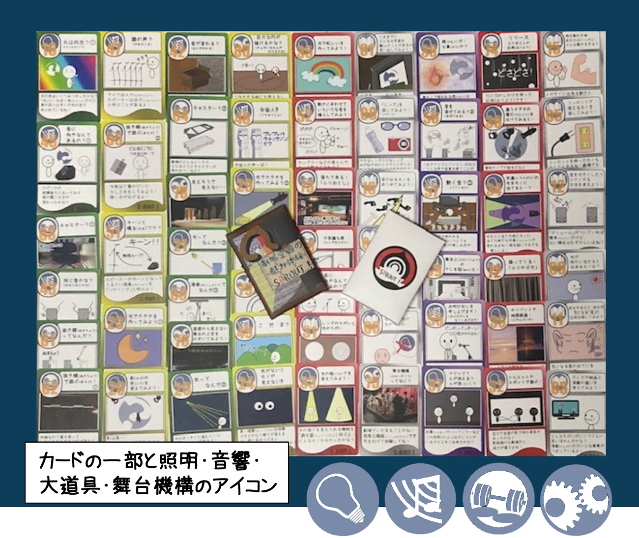 ③ 特徴的なポイント…カードは基本情報として「タイトル 写真やイラスト 解説文」から成り立ち、また、音響・照明・大道具・舞台機構に合わせてデザインされたアイコン、難易度によって5色に色分けによって、視覚的な楽しみもあります。