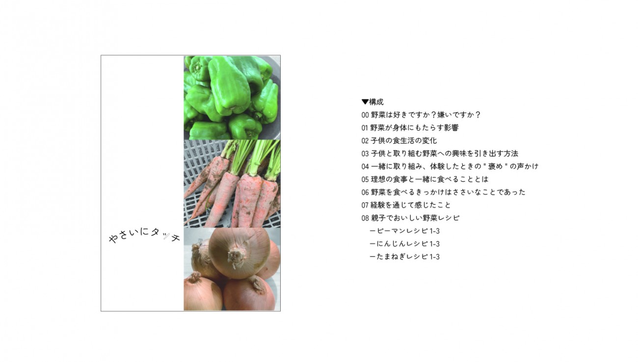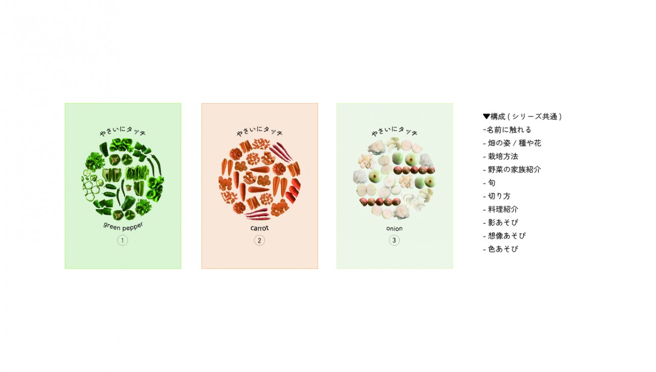 ■子供向け全3シリーズ / 食卓に出る機会が多く、栄養豊富で子供に食べてもらいたい野菜の中から、くせのある野菜を選定 / ピーマン・にんじん・たまねぎの3種をシリーズ化し、同じ構成で野菜の様々な姿に触れることで野菜への興味を引き出す / A5 サイズ(148㎜×210㎜) 全36ページ