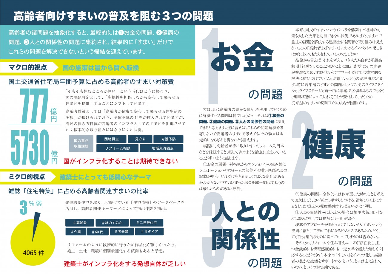 本書ではMITという生活様式を提案し、この人類史上初めてとなる100年というライフスパンをどうしたらイキイキ過ごすことができるのかについて考察を重ねてきました。「高齢者におけるインフラとしてのすまい」は社会としても、一個人の幸せとしても無視することができないテーマであると、改めて思い至っています。高齢者の長生きにまつわる諸問題に対して、1人でも多く気づきを与えることができたなら幸いです。