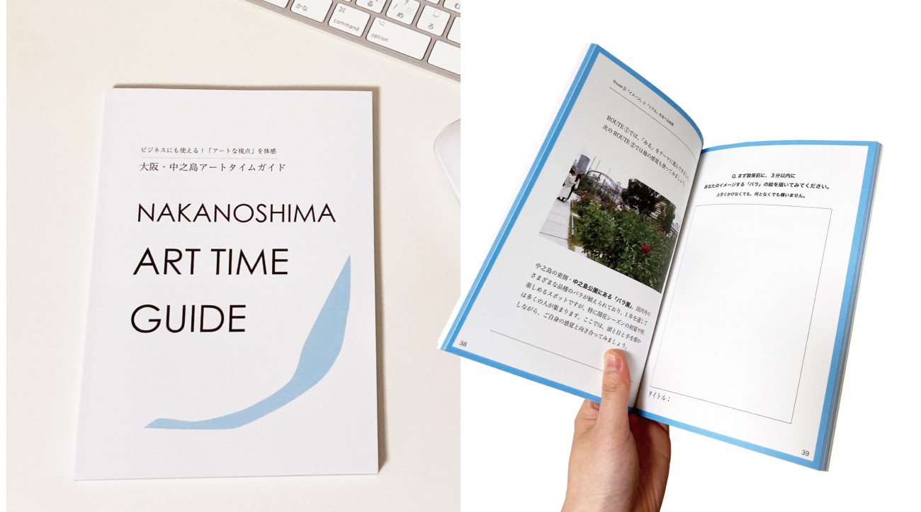 この「アート思考」を体験できる時間を「アートタイム」と名付け、アートに馴染みがない方でも まち歩きの中で気軽に体験できるよう制作したのが、【NAKANOSHIMA ART TIME GUIDE】。 直接書き込めるA5サイズのワークブックです。