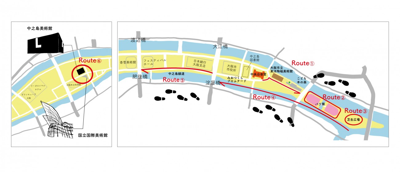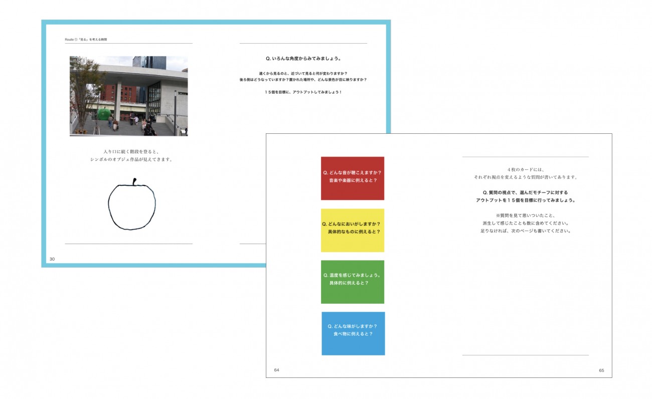 ガイドブックでは、中央公会堂を起点として、6つのアート思考を体験できるルートを選定しました。 各ルートにテーマを設定し、美術館の展示室を歩くように「アート思考」を体験できる時間(アートタイム)を提案しています。 <提案するアートタイム> Route① :「見る」を考える時間 Route② : 「イメージ」と「リアル」を並べる時間 Route③ :「こんな感じ」を表現する時間 Route④ :違う「感覚」を楽しむ時間 Route⑤ :「立ち位置」を変える時間 Route⑥ :「自分だけの問い」を見つける時間 Route①から順番に取り組むのはもちろん、どこか1つのルートだけ部分的にも取り組むことが可能で、 中之島の新たな一面を発見できたり、従来のガイドブックとは異なる体験が得られるような内容です。