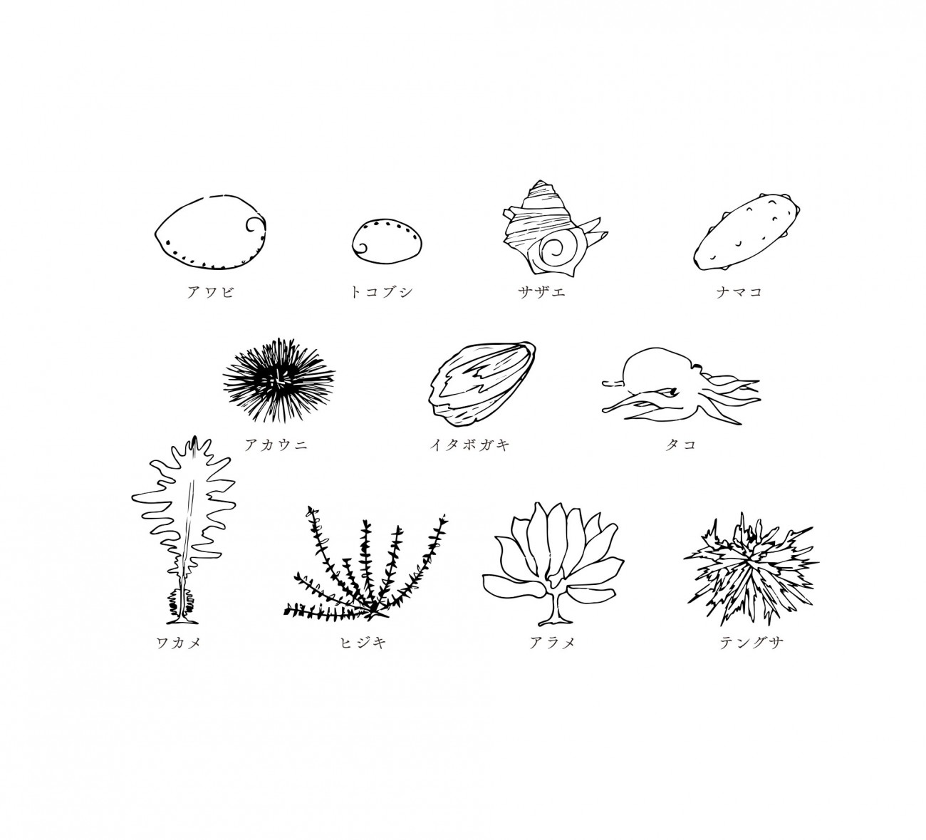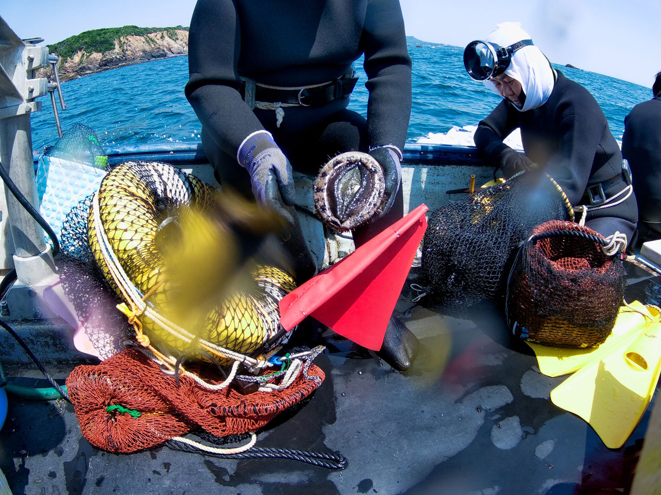 「海女の仕事」 これらは海女が海で獲るものです。 アワビやトコブシはカギノミという道具を使って獲ります。一方で、サザエやナマコは拾うようにして獲るので一度の潜水で両手いっぱいに海面へと上がってきます。そうなると、漁獲量はアワビなどより多くなるのでとった獲物を入れておくタンポという道具の大きさも変えます。 ワカメやヒジキなどの海藻も手作業で刈り取ります。刈り取られた海藻は、天日干しされ不純物などを丁寧に取り除いてから市場へと持っていきます。海で体力の必要な作業をした後には、気の遠くなるような作業が陸で待っています。