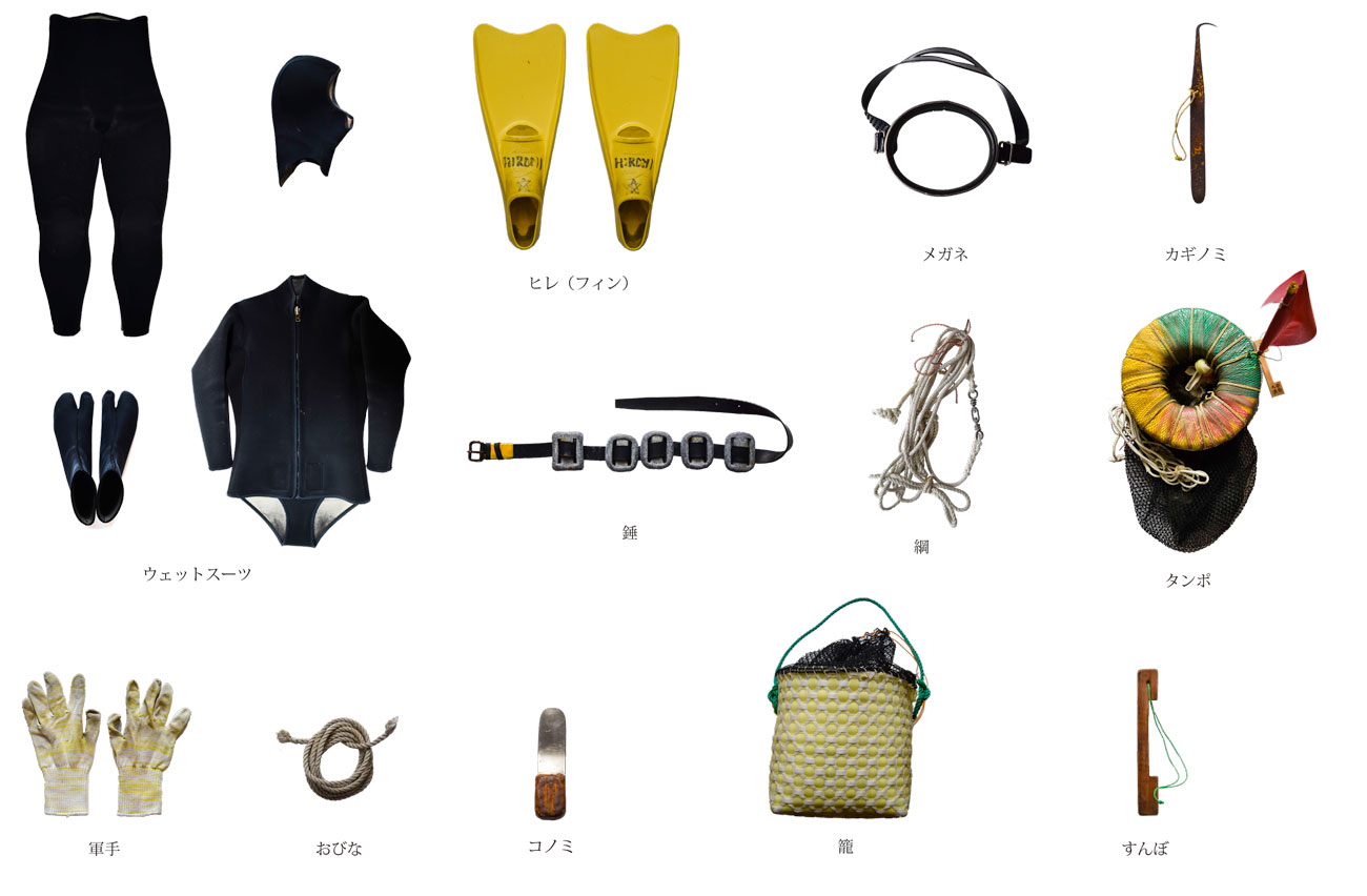 「海女の道具」 海女が主に使用している道具です。これら以外にも道具があるのですが、使用頻度が少ないので載せなかったものもあります。 昔から変わらない形を保っている道具や時代と共に変化した道具もあります。どの道具も大切に手直しをしながら使っています。自分で直すのが難しいウェットスーツは購入したお店で直してもらうことが多いです。海女の多い地域だからか、海女のウェットスーツを専門に作っているお店があるのでそこを利用する人が多いです。