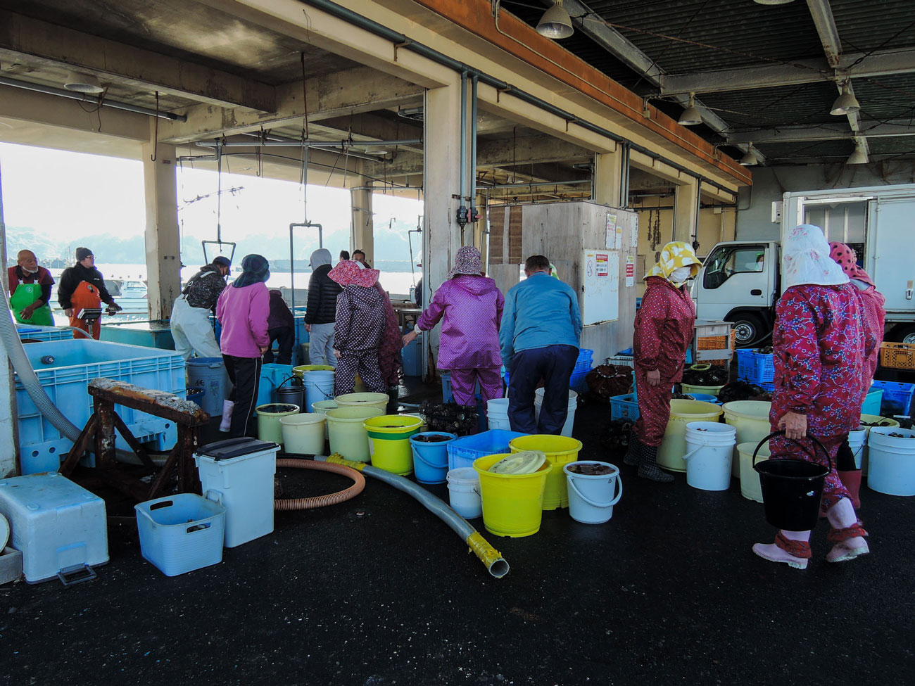 「海女の生活」 漁が終わった後に向かう計量の様子です。この時はサザエとナマコの計量でした。 海に潜ってくるだけが仕事ではありません。このように獲ってきたものを計量に持ってきたり、朝から漁に行き昼から別の仕事をしたり、その合間には家事もこなします。海女漁を行う人たちは一日中休む暇もなく働き続けています。 休む暇もなく働く理由は人それぞれに事情があるのは当然です。しかし、志摩半島地域の海女に対して「海女だけでなく家のことや他の仕事をこなさなければならない」という昔からある社会規範があります。私はその影響が大きいのではないだろうかと思いました。