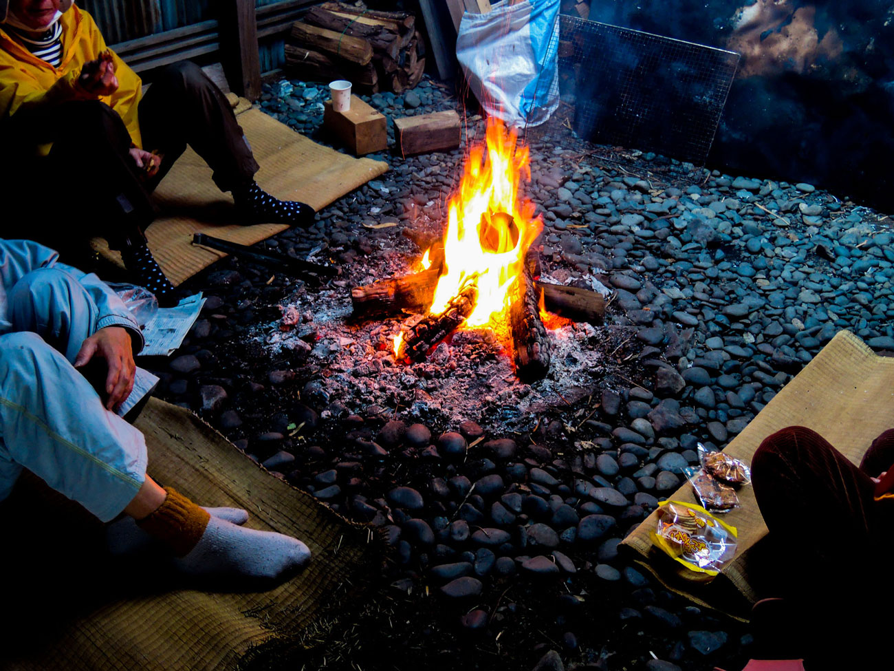 「海女とコミュニケーション」 かまどの中はこのようになっています。茣蓙を引いて座り、漁から帰ってくるとお昼ご飯やお菓子を食べたりしながら休憩します。 その日の漁獲量であったり、海の様子、他愛もないことなどを話します。最近では「海女小屋体験施設」と呼ばれる商業施設がありますが、これが実際に使われているかまどの様子です。火を囲んで温まり、緊急時には一致団結する仲間たちが集う場所です。
