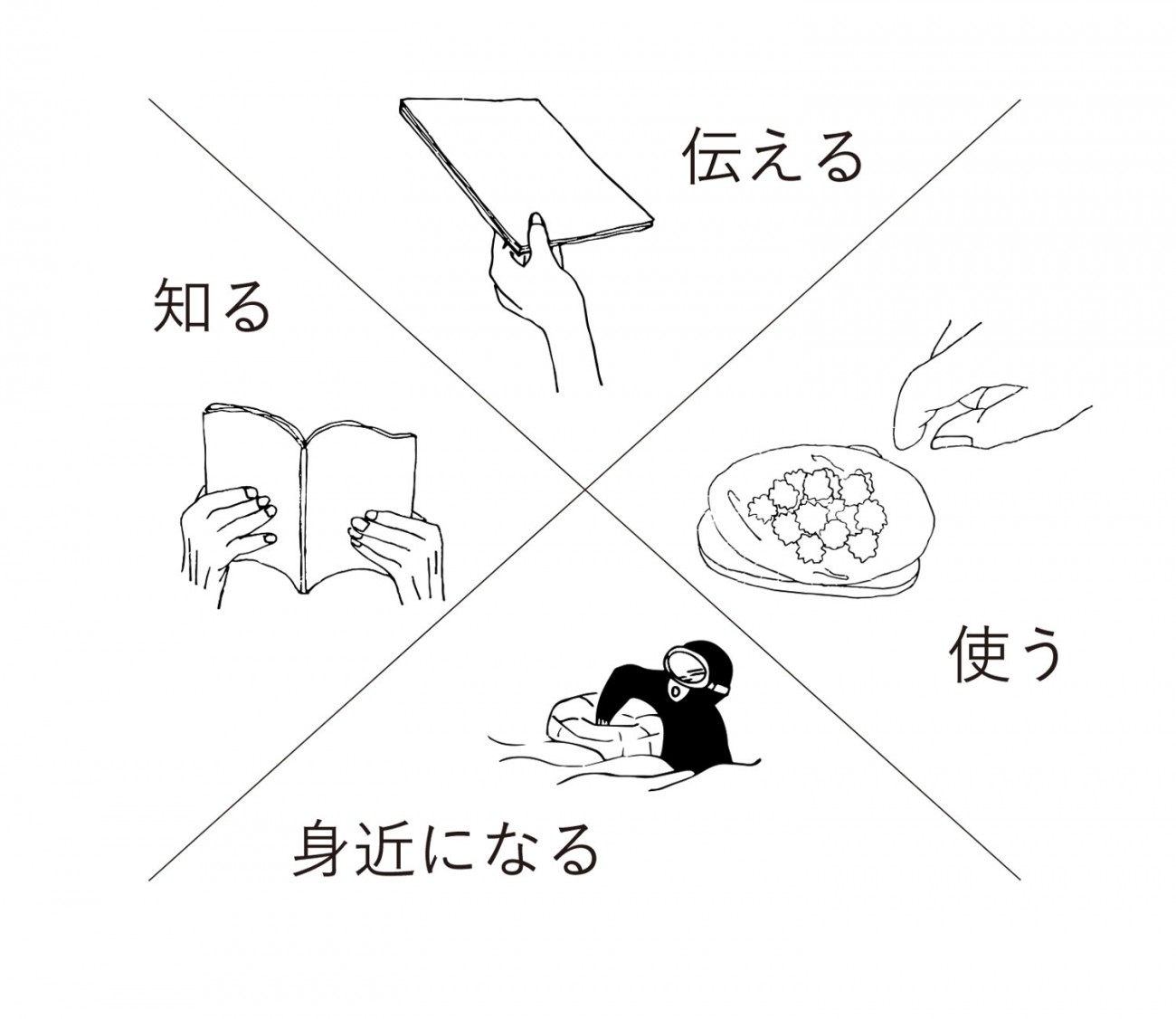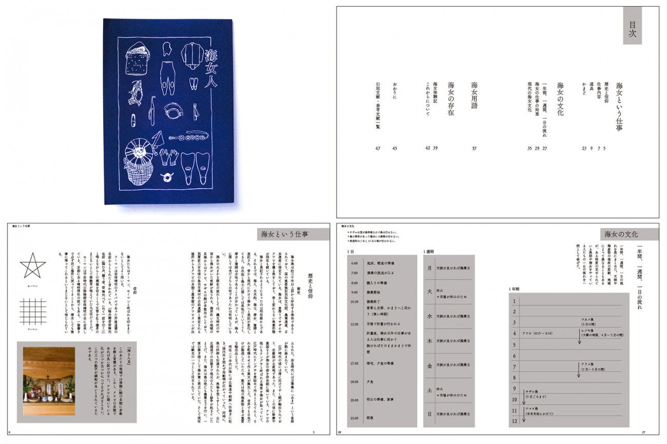 「海女人」の発行 まずzine形式の冊子「海女人」には海女の基本的なことや実際に海に潜った際の体験記など海女が身近にいる私だからこそ調査・取材できたことが書かれています。この冊子をアーカイブとして機能させて人々にこの伝統文化の存在を知ってもらいます。それだけでなく、海女の文化は地域によって異なるので海女の文化交流の1つツールとして活用することもできます。 左上:表紙 右上:目次 左下:海女という仕事について 右下:海女文化について