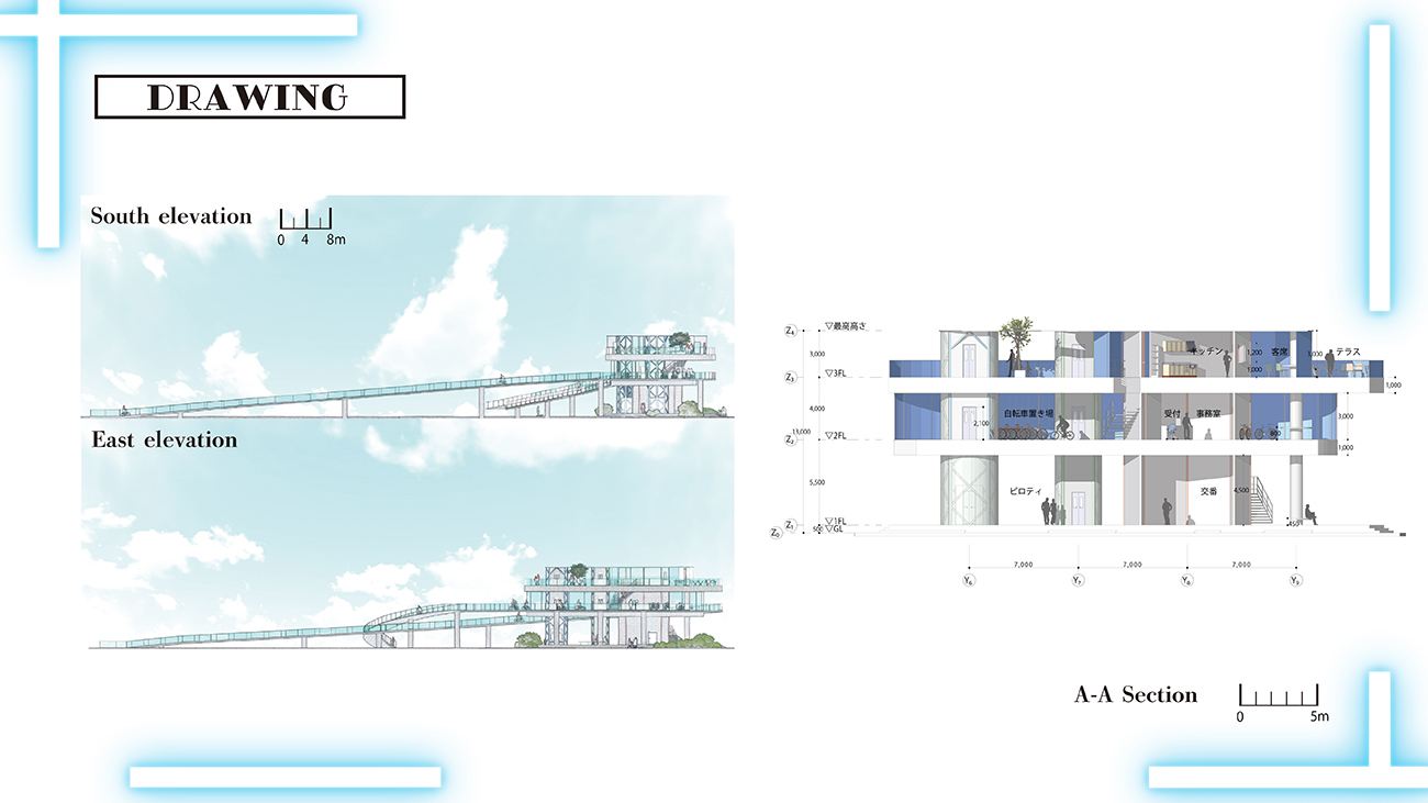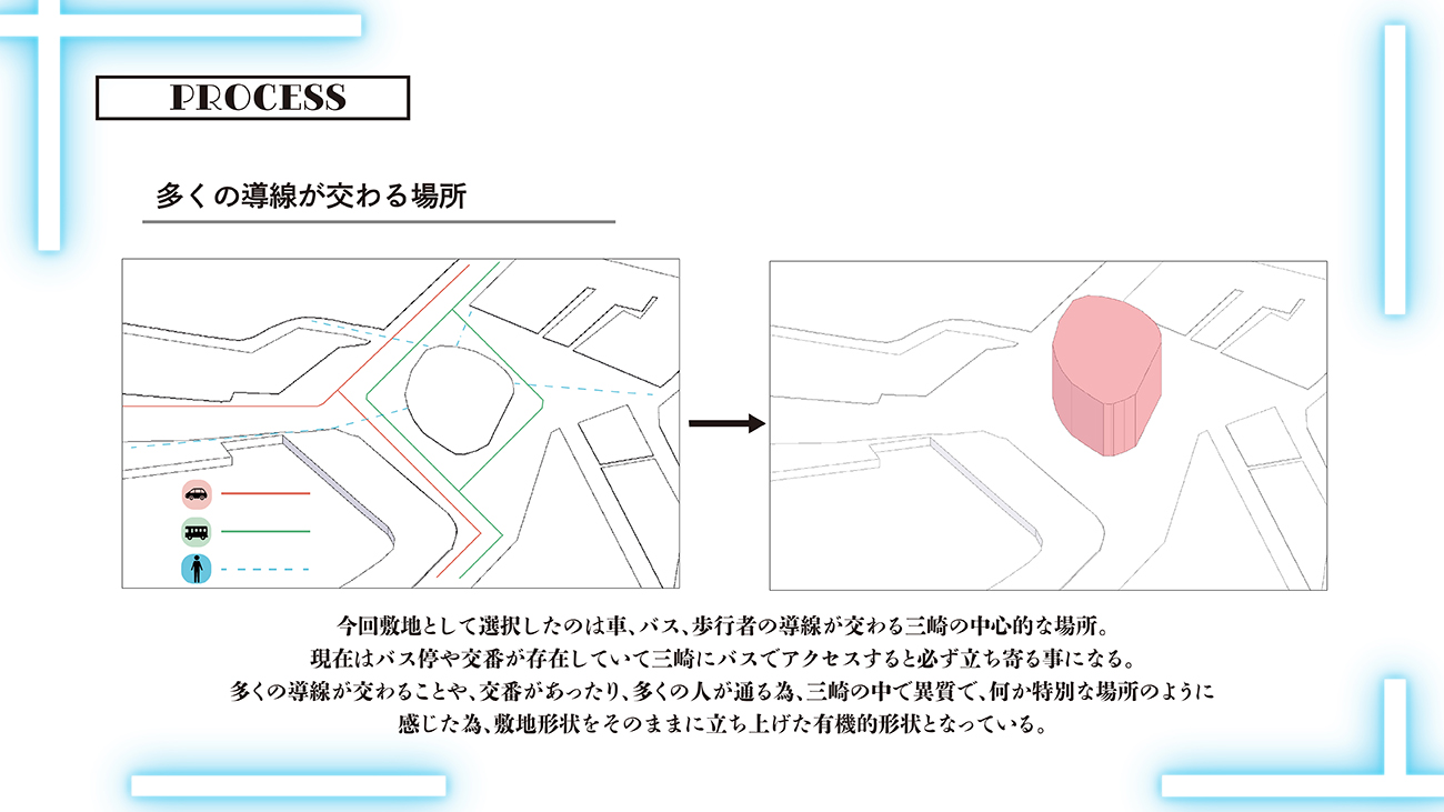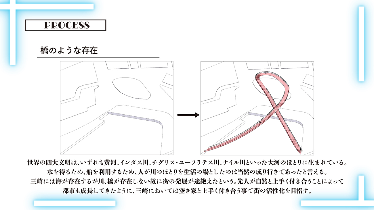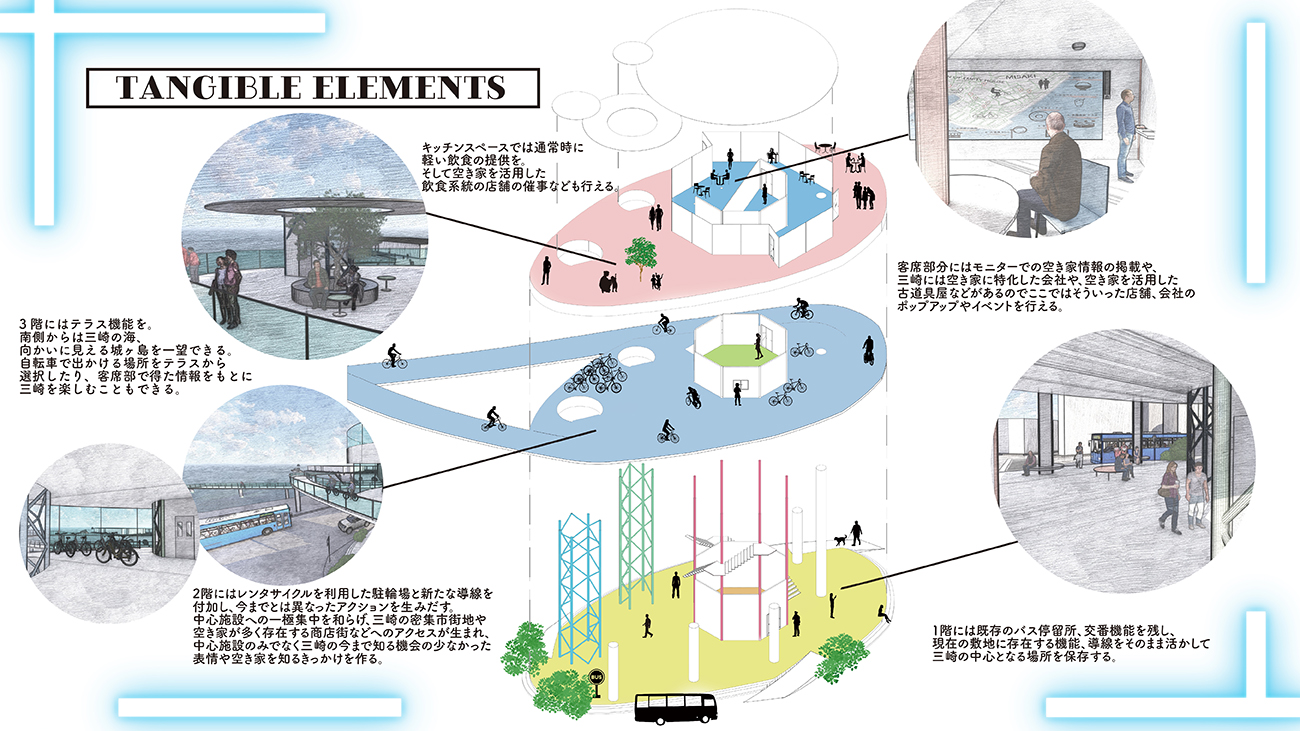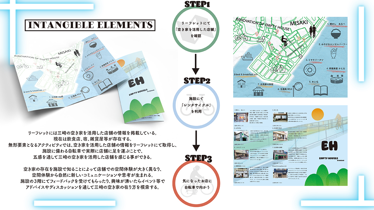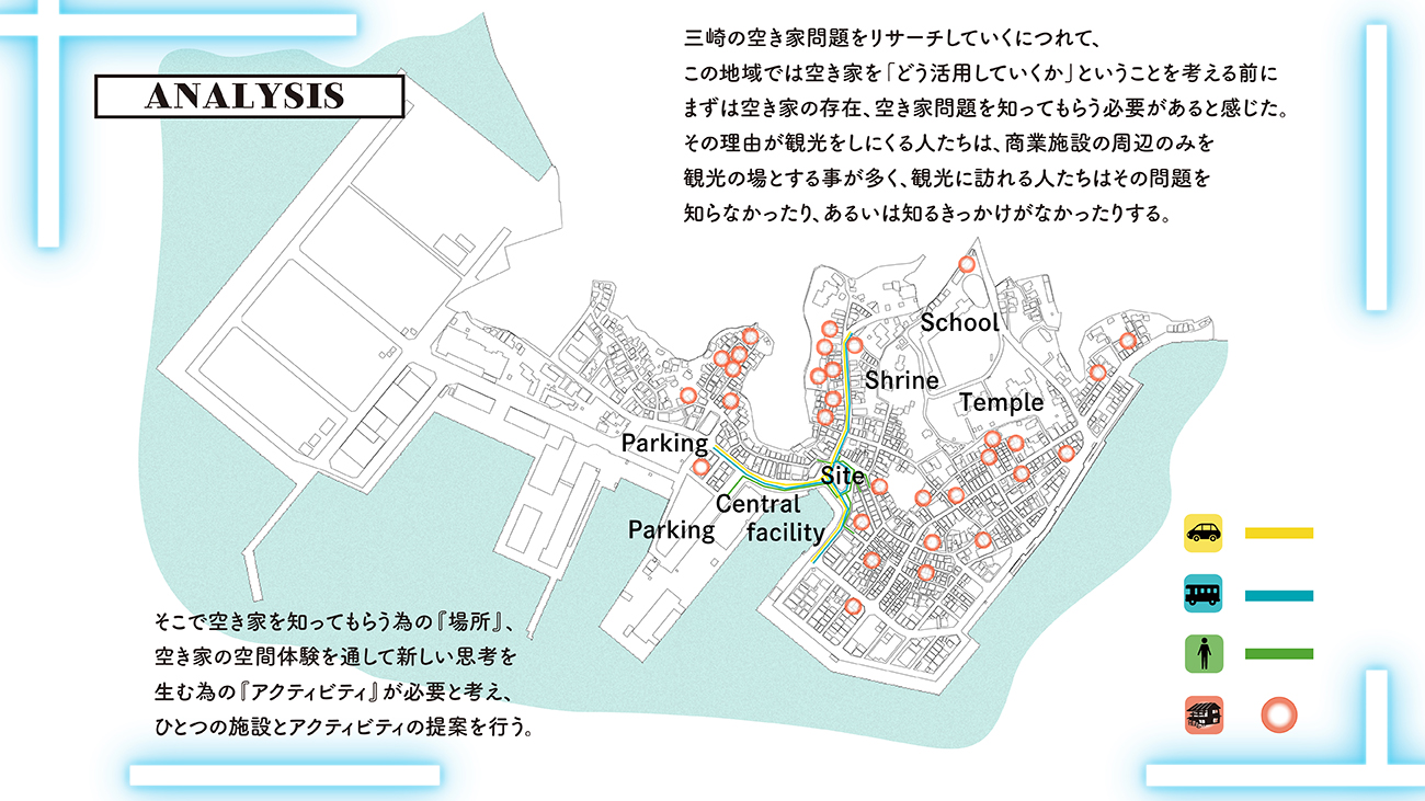 この国の各地で起こっている空き家問題に対しての新しい提案を行った。今回選択した三崎という地域では空き家をどう使うか、どういった用途に転用が可能かという事を考える前に、空き家を知ってもらうきっかけが必要であると考えた。この目的を果たすために有形要素となる施設、無形要素のアクティビティを提案した。