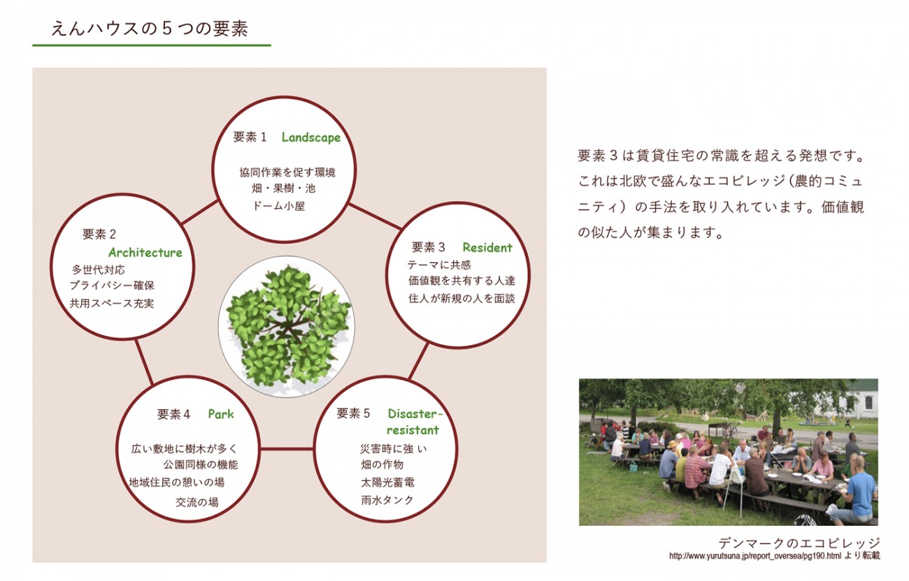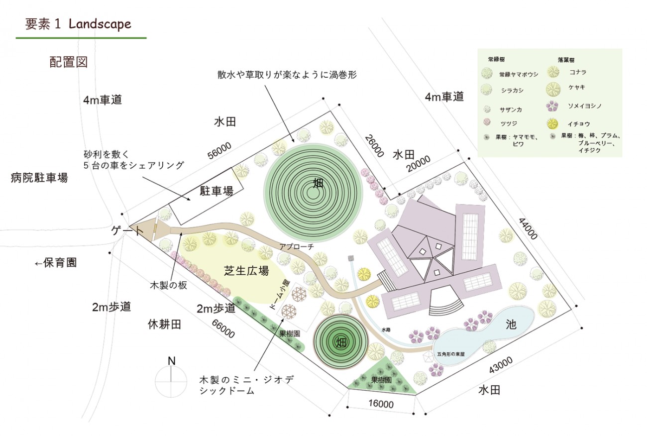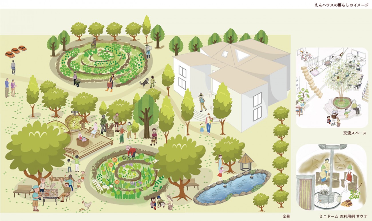 かつての里山のように住宅の近くに樹木と畑を配置することで、自然がもたらしてくれる恵みを日常の暮らしに取り入れることができます。人はみな自然の中で育まれていることを肌で感じることができれば、地球環境への配慮も自ずと芽生えると考えます。協同して作業に取り組むことで、助け合いの機会はさらに増えます。