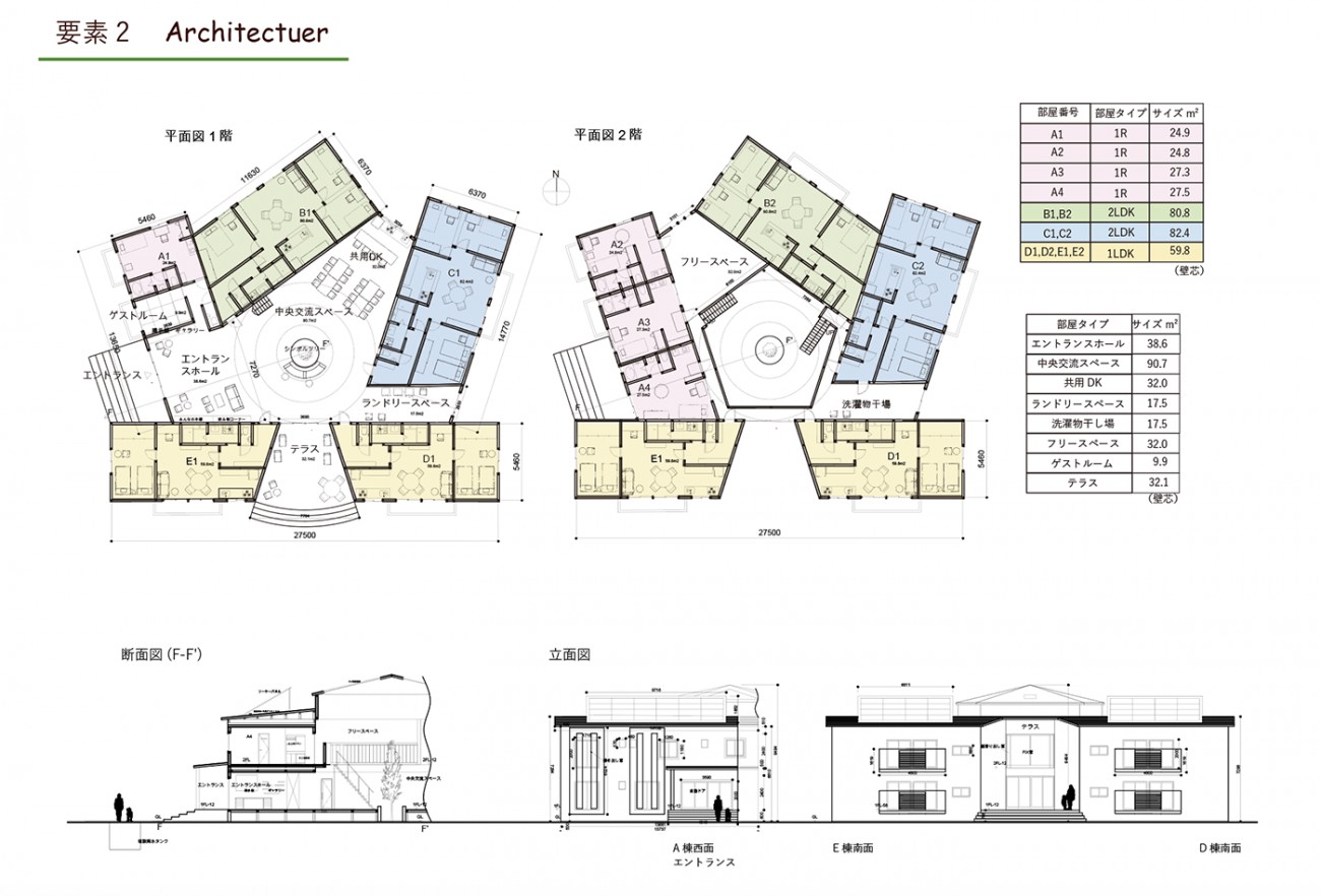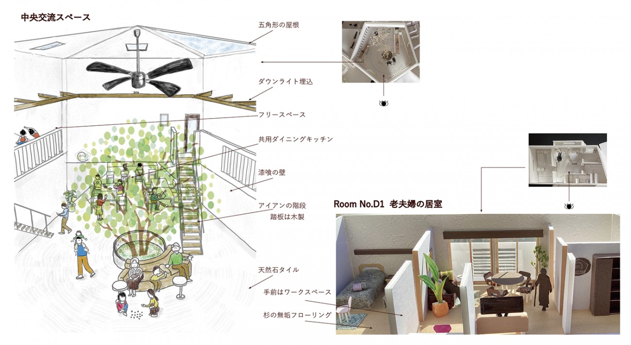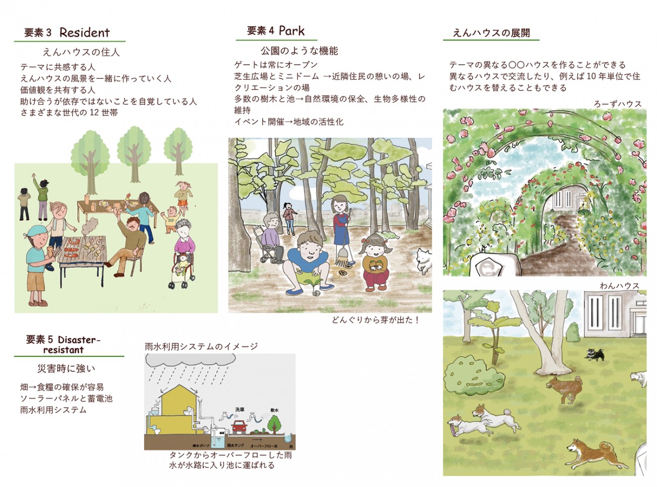 「地球の恵みを享受しながら多世代が助け合って暮らす集合住宅」をテーマとし、このテーマに共感するさまざまな世代が暮らし、地球の恵みを取り入れる環境を住人が協力して作ります。地域住民の憩いの場になり、広場でイベントなどを開催して地域を活性化します。雨水と太陽光エネルギーを蓄えることで災害時に強い集合住宅とします。