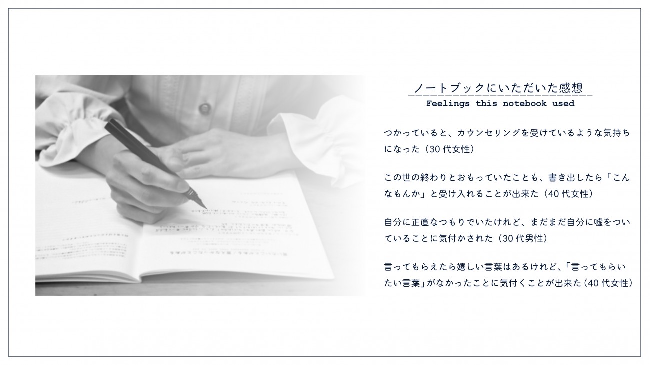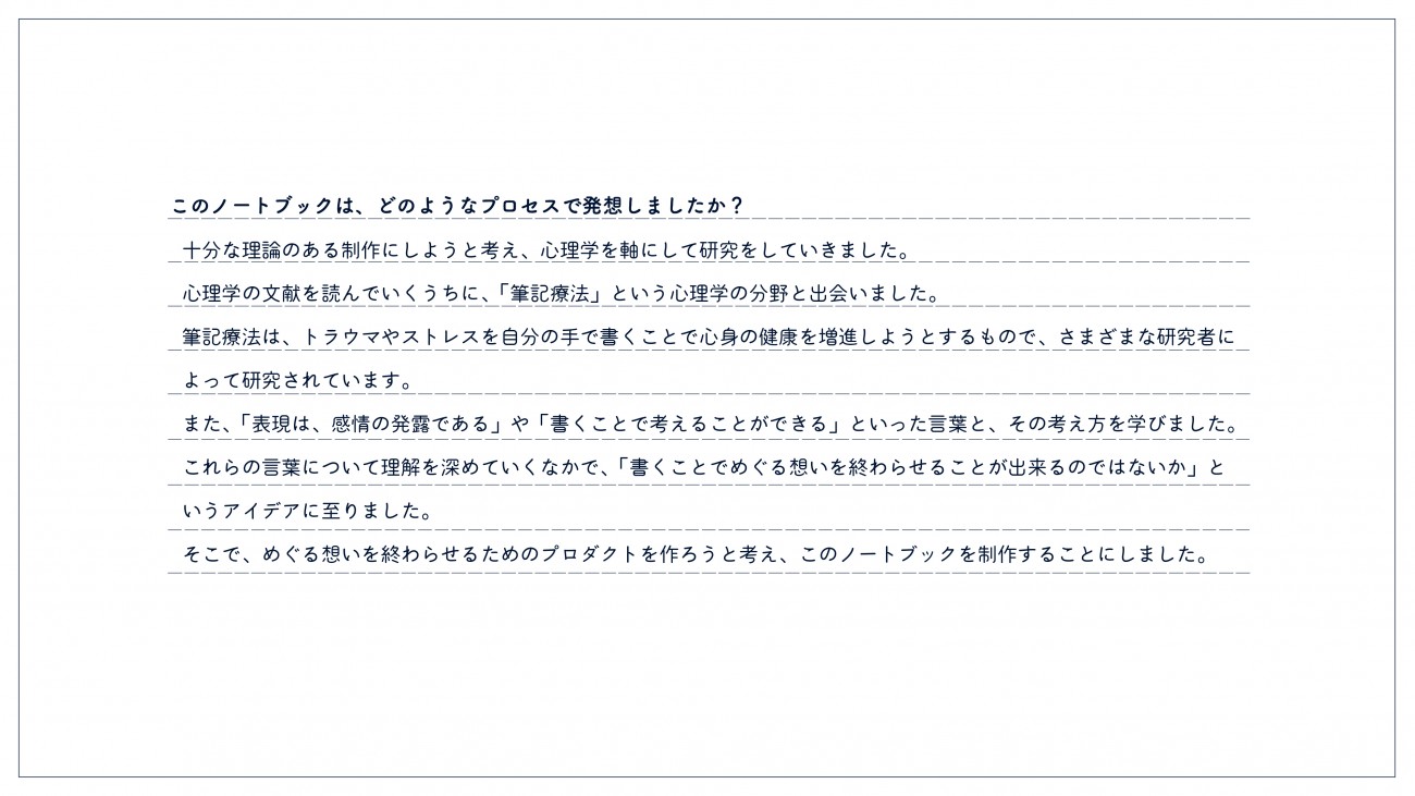 これらの言葉について理解を深めていくなかで、「書くことでめぐる想いを終わらせることが出来るのではないか」というアイデアに至り、「手で感情・思考を表現する」ことをコンセプトにしました。