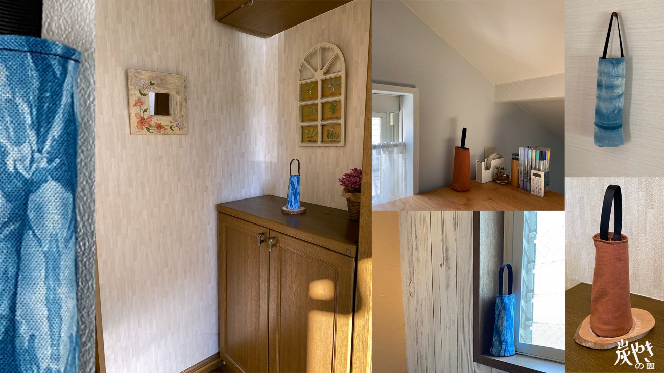 ノベルティ:炭粒が入った飾り、地域の藍染とのコラボ