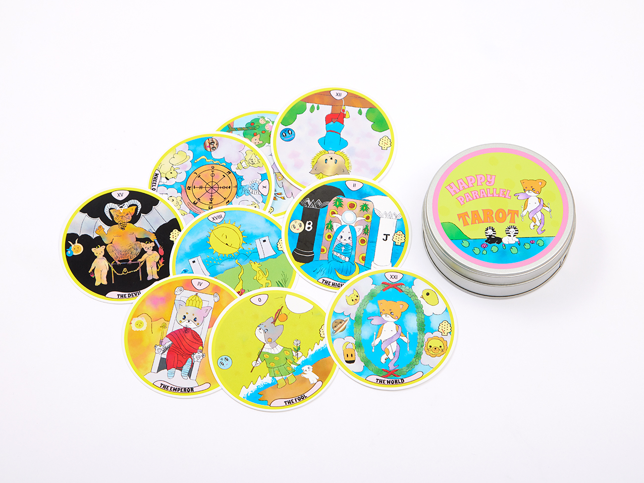 このHAPPY PARALLEL TAROTは、色は黄色を基調とし、形は丸型、絵は子どもが描いたようなタッチのアニマルET柄。明るく元気ハッピー!のイメージで制作。ウエイト版タロットを基調とし、西洋占星術と生命の樹の要素を加えました。最高な未来を思い出して、つまり望む未来を設定してHAPPYなパラレルワールドを選んでいきましょう♪