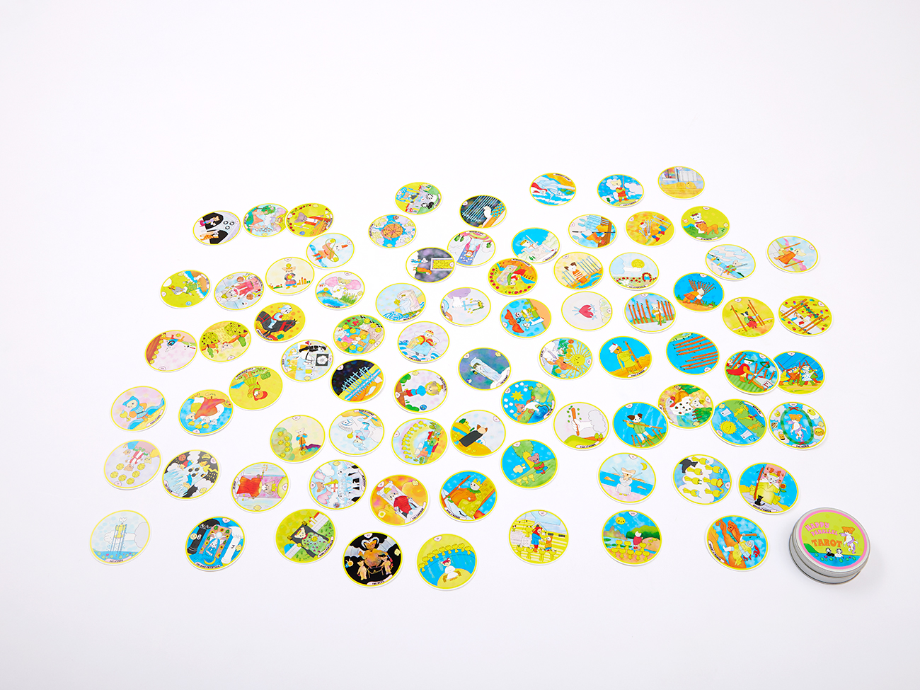 タロットカード(直径90mm×78枚)、解説カード、丸缶ケース