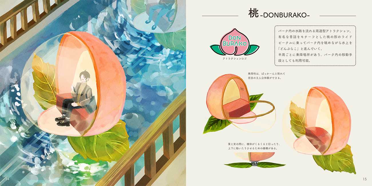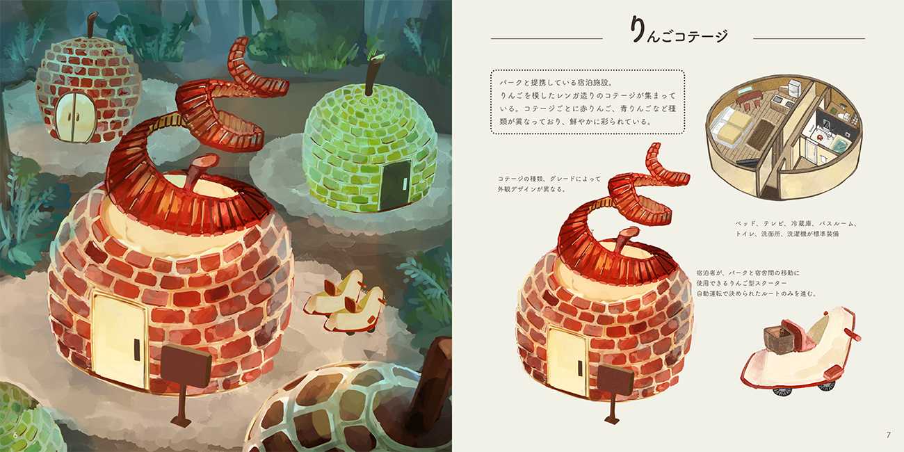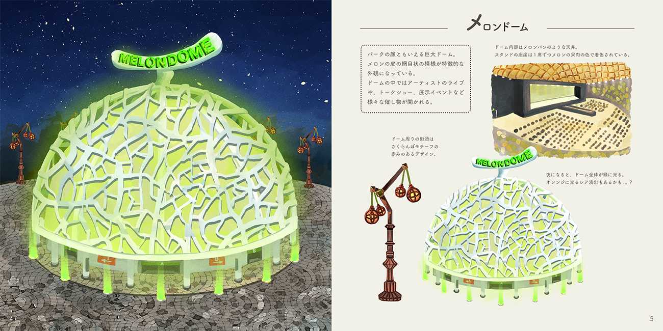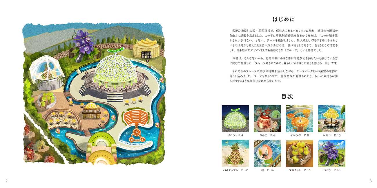 色、形状、果肉、皮などの特徴が面白いものとして、メロン、りんご、オレンジ、レモン、パイナップル、桃、マスカット、ぶどうの8種類を選定し、実際に建設可能ではないかと思われる建造物となるよう制作しました。フルーツの形状や特徴を活かしながら様々な建造物のデザインを提案し、テーマパークという架空の世界にデザインを落とし込んでいます。また、左ページ一面に建造物のイラストを配置し、右ページには解説や小ネタなどを載せることで、世界観へのイメージを強め、こだわりが伝わるように意識したつくりとなっています。