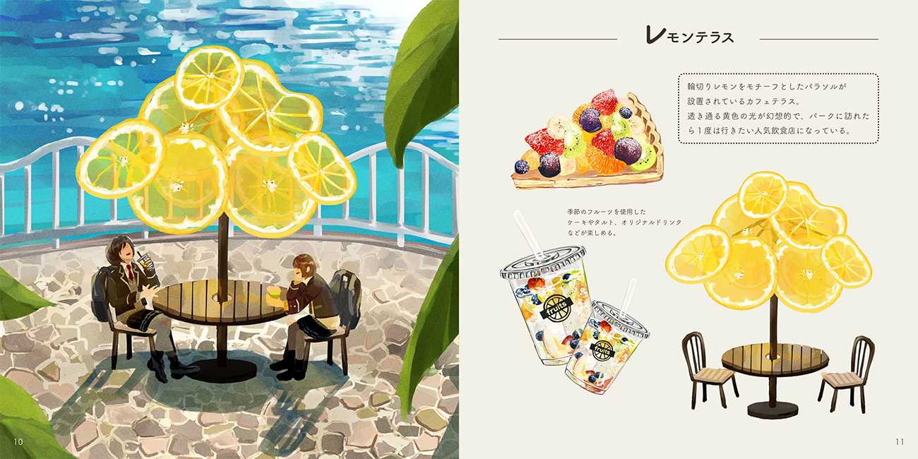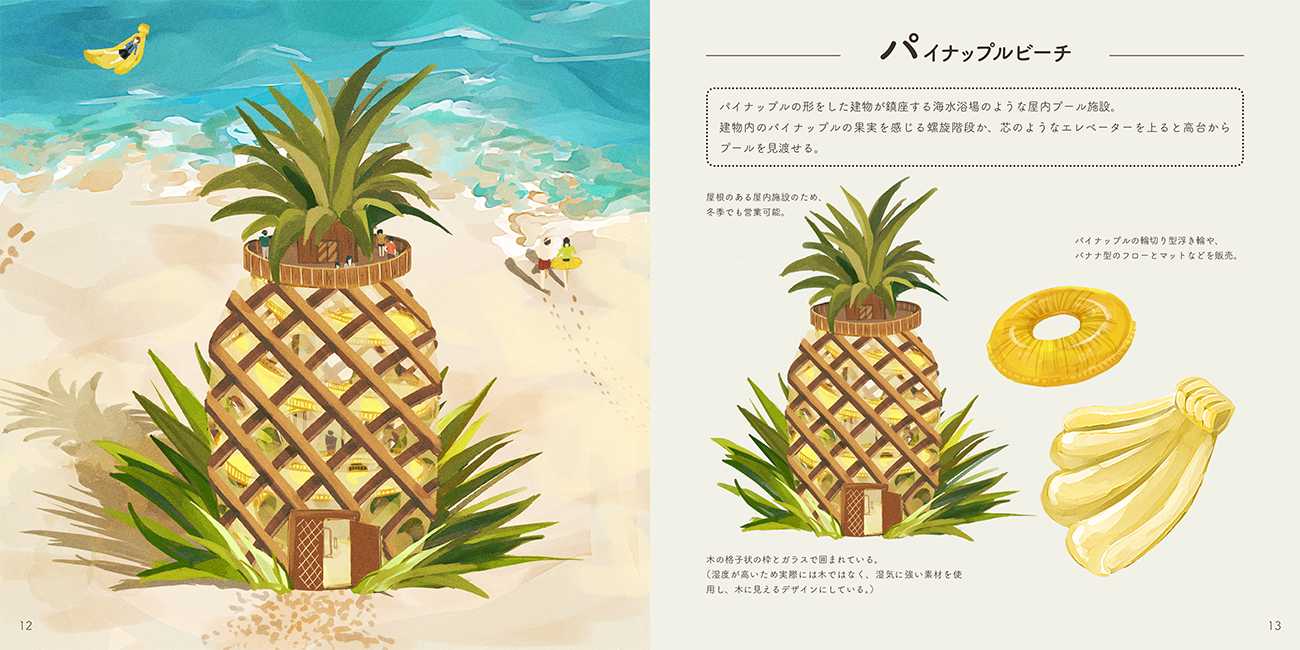 本作品は、フルーツ好きのための、日々の暮らしにひとさじの彩りを添える一冊として「フルーツ×建造物」という視点で、テーマパーク構想を描いたイラスト集です。