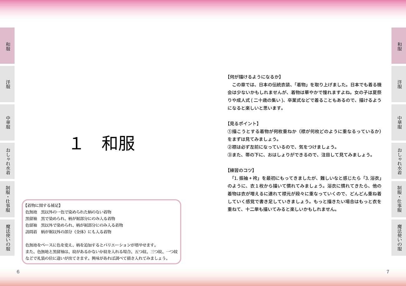 その思いがあったため、絵を描き始めたばかりで、どんな衣装を描いていいのかまずわからない。衣装のことがわからない。そんな方がまずは衣装のことを少しでも知って、描いてみようと思えるようなイラスト帳を作ろうと考えました。