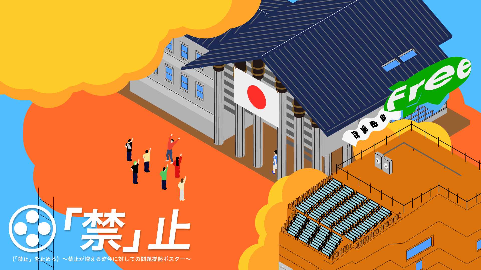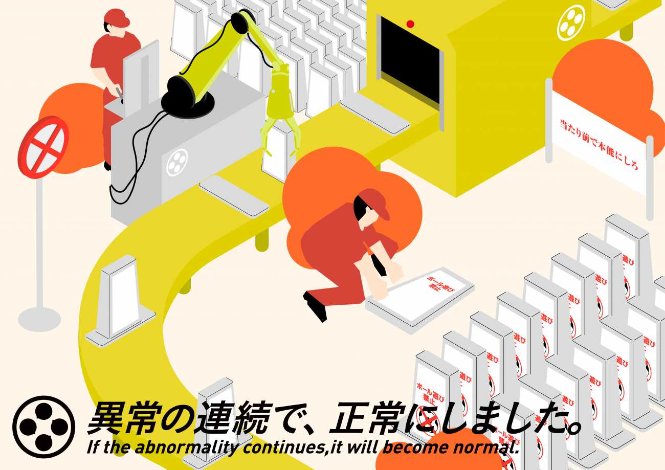 この問題が冒頭で挙げた、三つの要素とマッチしました。この問題提起を行い、過剰な禁止運動を抑制することで世の中に対してのメリット、この禁止運動の増加によって、子どもの可能性が損なわれているのが現状。果たして、そこまでして過剰に禁止にすべきなのかという疑問。そしてより多くの人への認知が必要であるため、イラストにデザイン性も込めた今回の作品が出来上がりました。イラストの基盤が120度で構成される、アイソメトリック法による、機械的、情報的、ユーモアな表現によって、今回の問題を見る方へ鮮明に伝わるものになりました。ポスターとして展開していますが、作品全てAdobe Illustratorで描画を施しているため、他サイズ、その他の媒体へもクオリティを落とすことなく変更可能です。