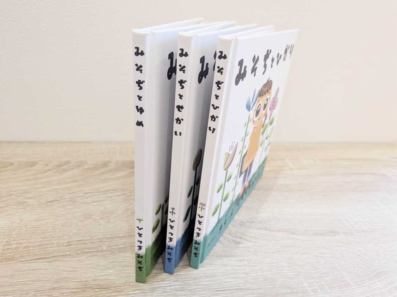 三部作の表紙です。左から右へ、少しずつ成長していく様子が分かるように表現しました。主人公の「みそぢ」と共に、背景も若葉→つぼみ→花と成長します。