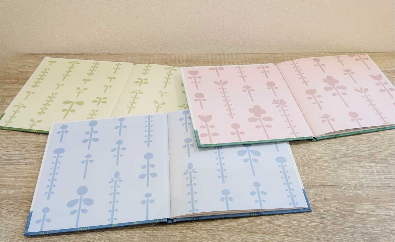 三部作の表紙裏です。表紙の背景である若葉・つぼみ・花のシルエットを使用してデザインしました。それぞれの物語のイメージに合う配色を考え、シンプルかつ可愛らしい仕上がりとなりました。