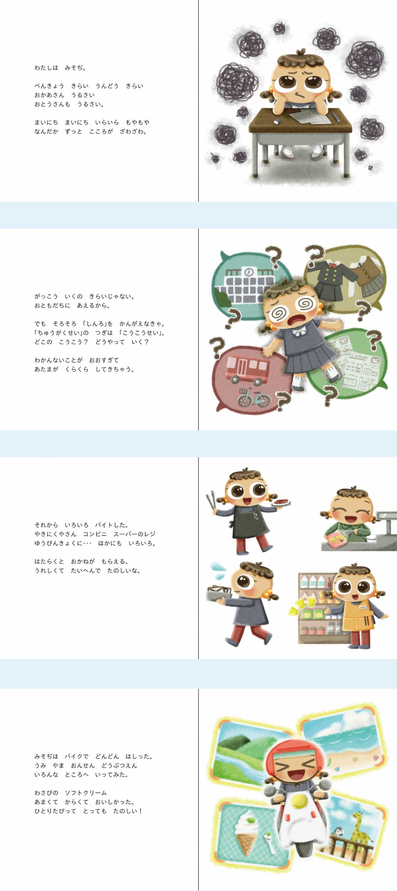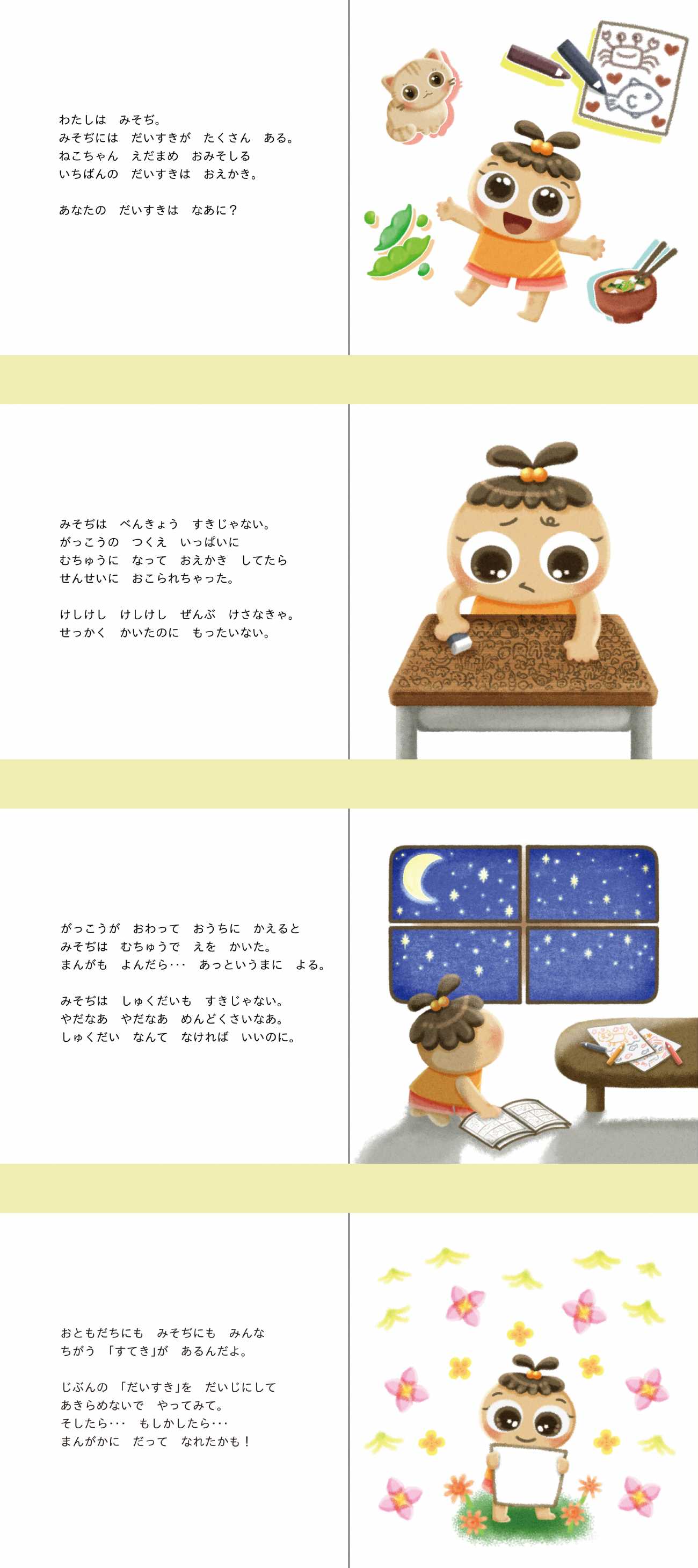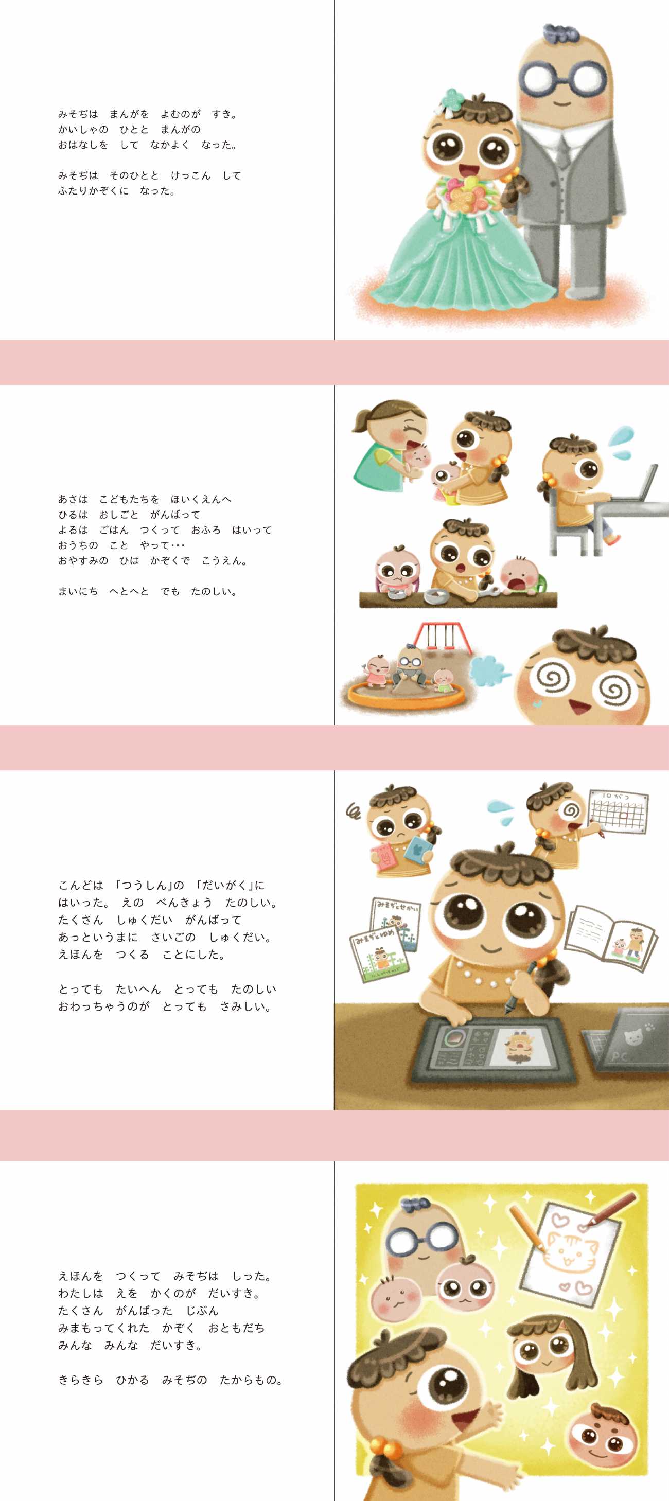 それならば、実際に目に見える形としてみよう。小学生にも分かりやすいように、絵本として私の人生を描いてみよう!